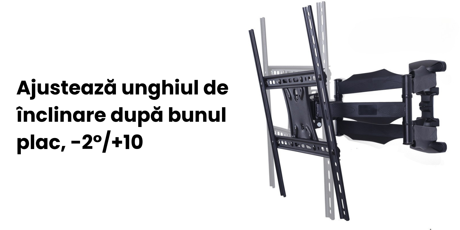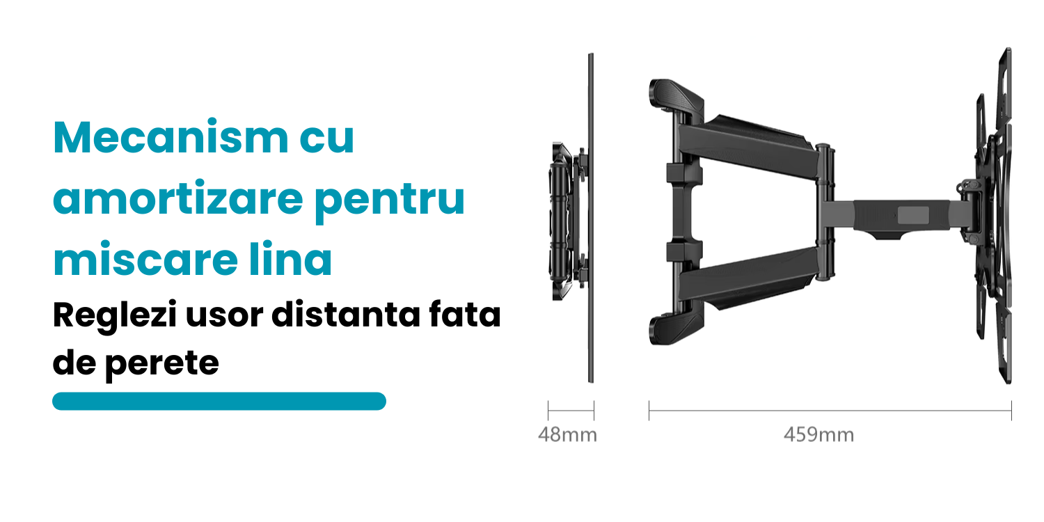 Mecanism pivotant si reglabil – sistemul cu amortizare pentru miscare lina permite ajustarea distantei fata de perete intre 48 mm si 459 mm, astfel incat sa gasesti unghiul perfect indiferent de locul unde te afli in camera. De asemenea, poti regla unghiul de inclinare intre -2° si +10°, eliminand reflexiile si obtinand confort maxim la vizionare.