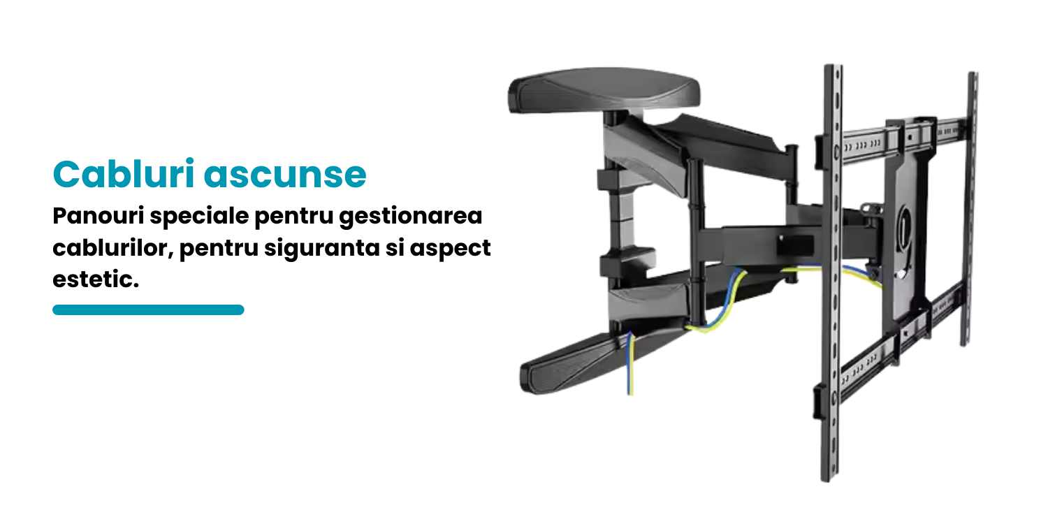 • Aspect elegant si organizat – cablurile pot fi ascunse prin panourile speciale de gestionare, pentru un look curat si contemporan, fara incurcaturi in spatele televizorului.