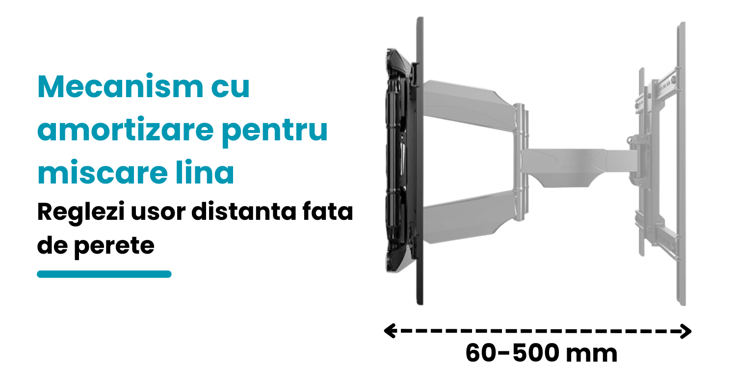 • Flexibilitate maxima – mecanismul pivotant permite rotirea pana la 160° si reglarea distantei fata de perete intre 60 mm si 500 mm, astfel incat poti ajusta televizorul exact cum iti doresti.