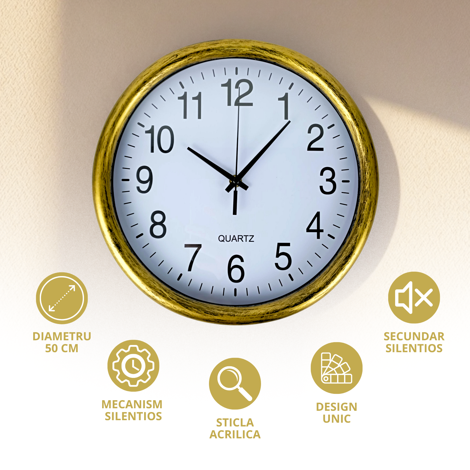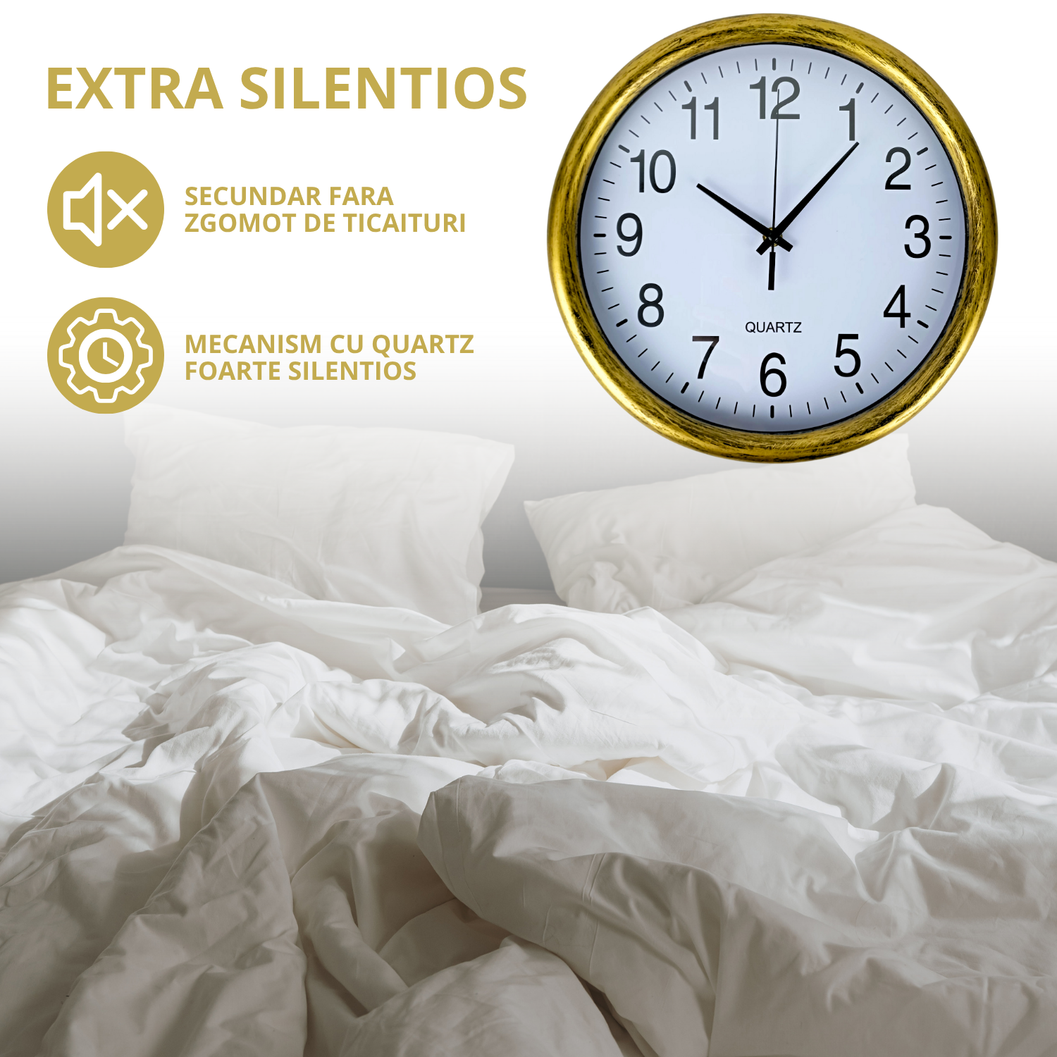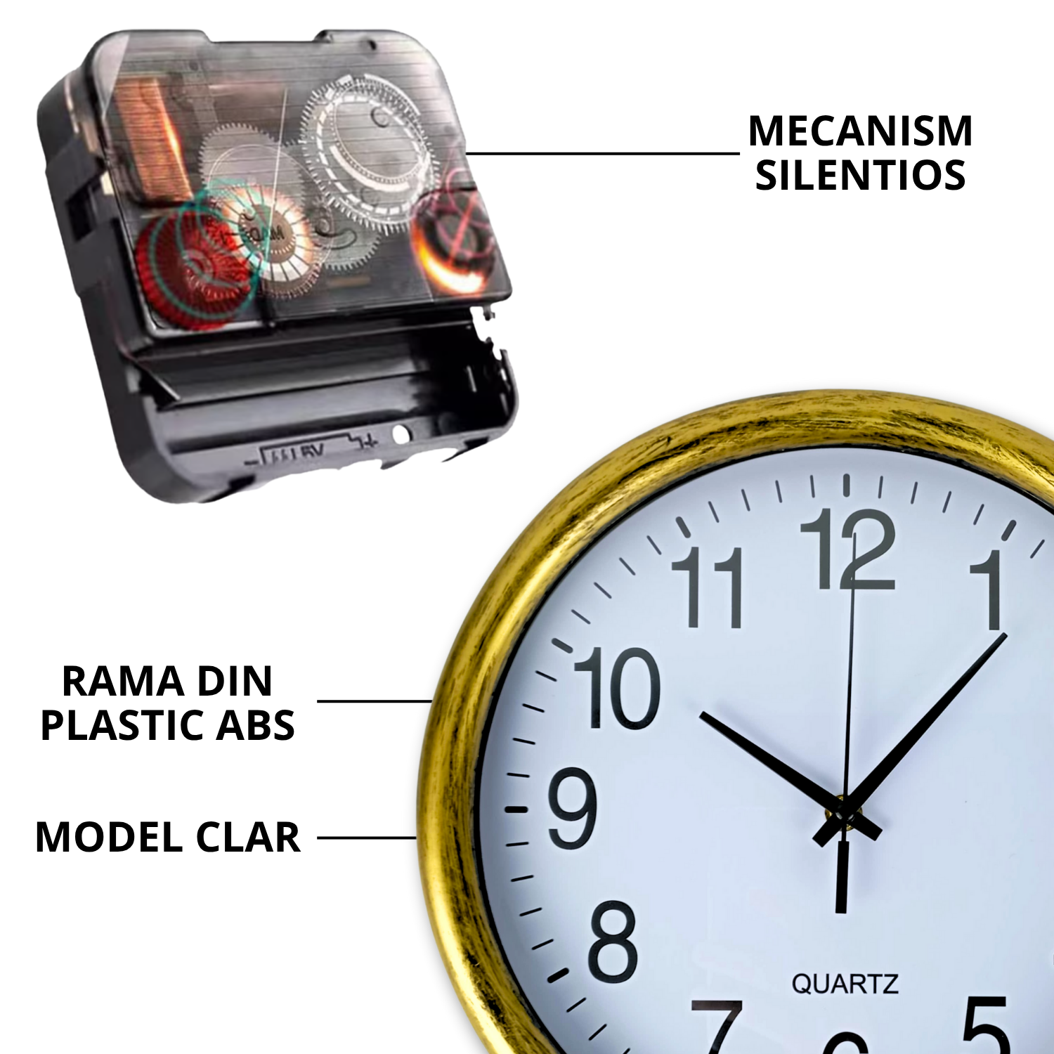 ☀️ Transforma timpul intr-un element de design si bucura-te de precizie, liniste si eleganta cu acest ceas de perete modern cu mecanism silentios si rama aurie!