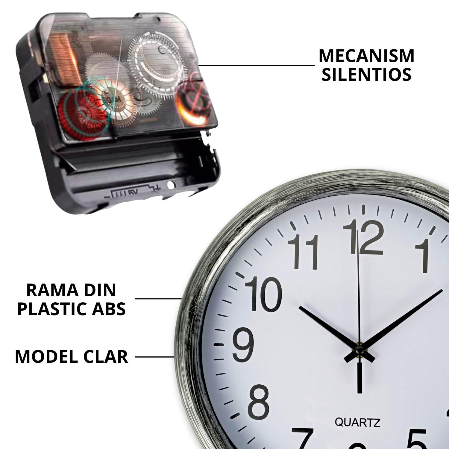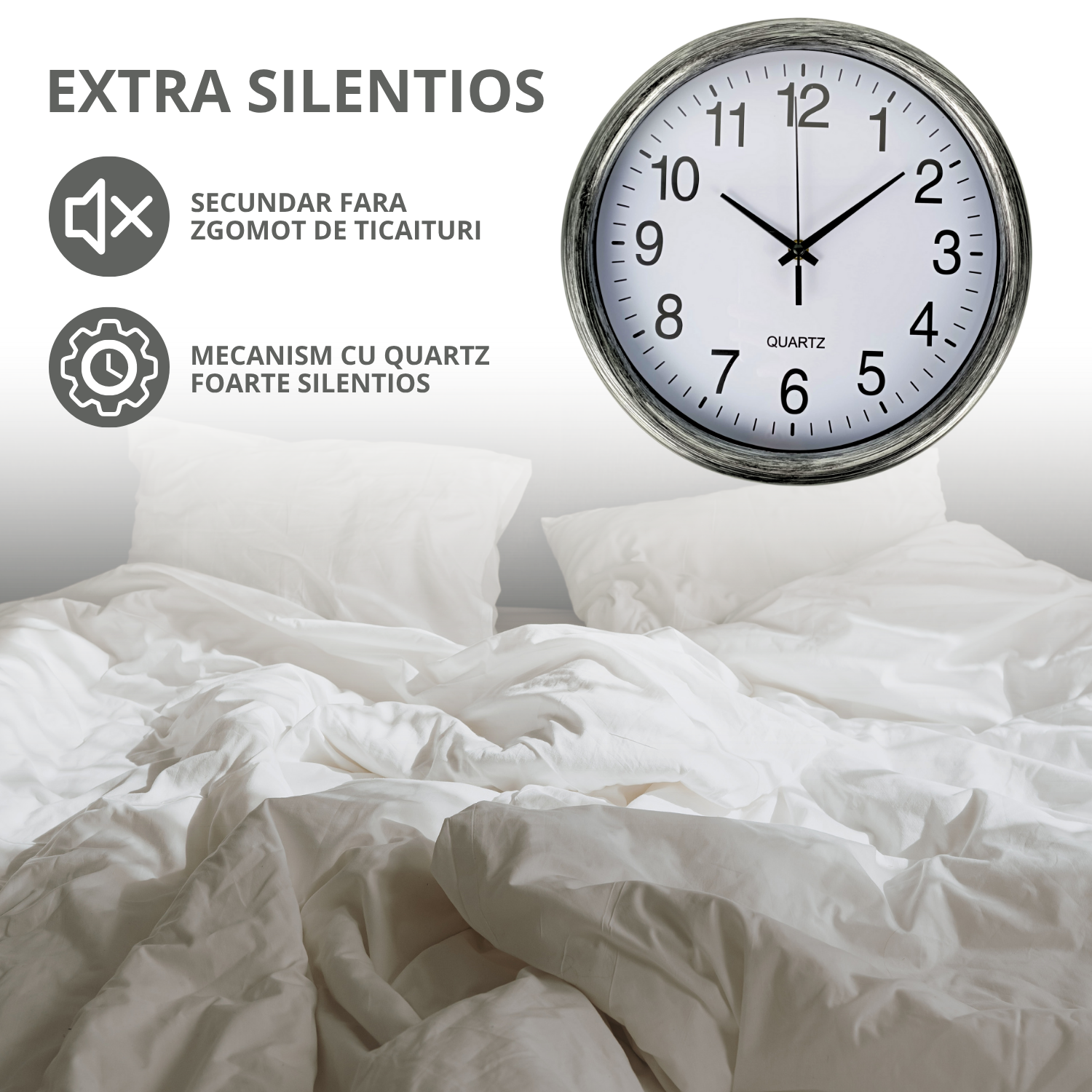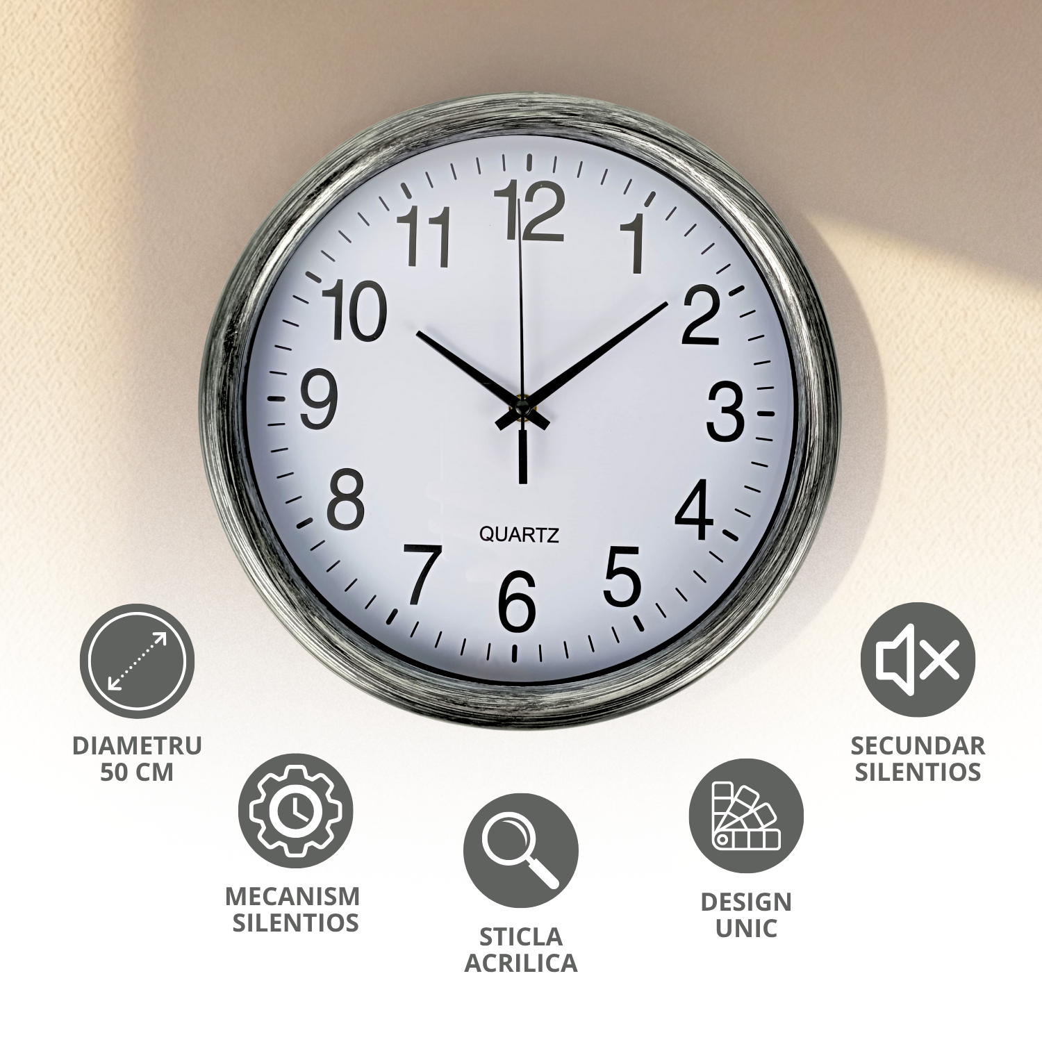 Unul dintre cele mai mari avantaje ale acestui ceas de perete este mecanismul cu quartz foarte silentios, care elimina complet sunetul de ticaieli deranjante. ✅ Aceasta caracteristica il face perfect pentru dormitoare, livinguri, birouri sau chiar spatii de studiu, oferindu-ti liniste si confort in orice moment al zilei sau noptii.
