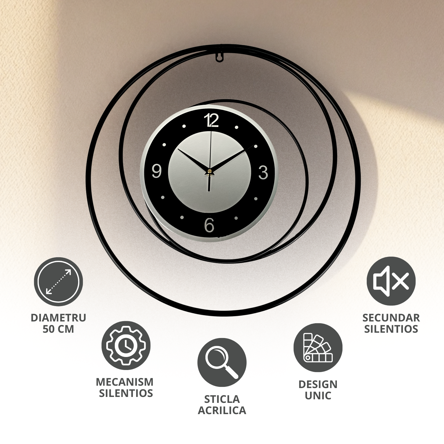 Transforma-ti peretele intr-un element decorativ de exceptie cu acest ceas de perete modern, extra silentios, cu diametru de 50 cm – o alegere practica, eleganta si de lunga durata. ♻️