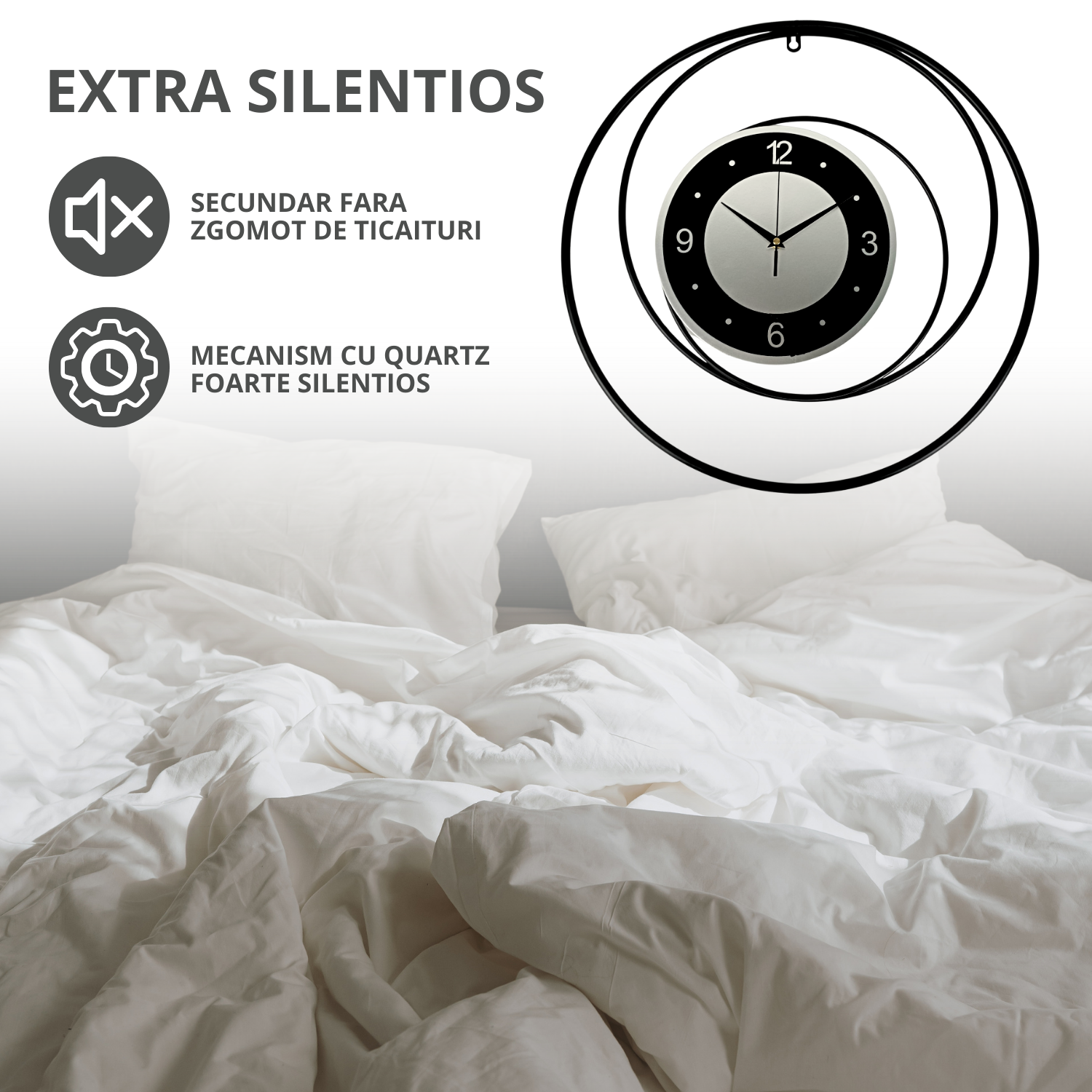 Mecanism quartz extra silentios, perfect pentru incaperi unde linistea este esentiala.