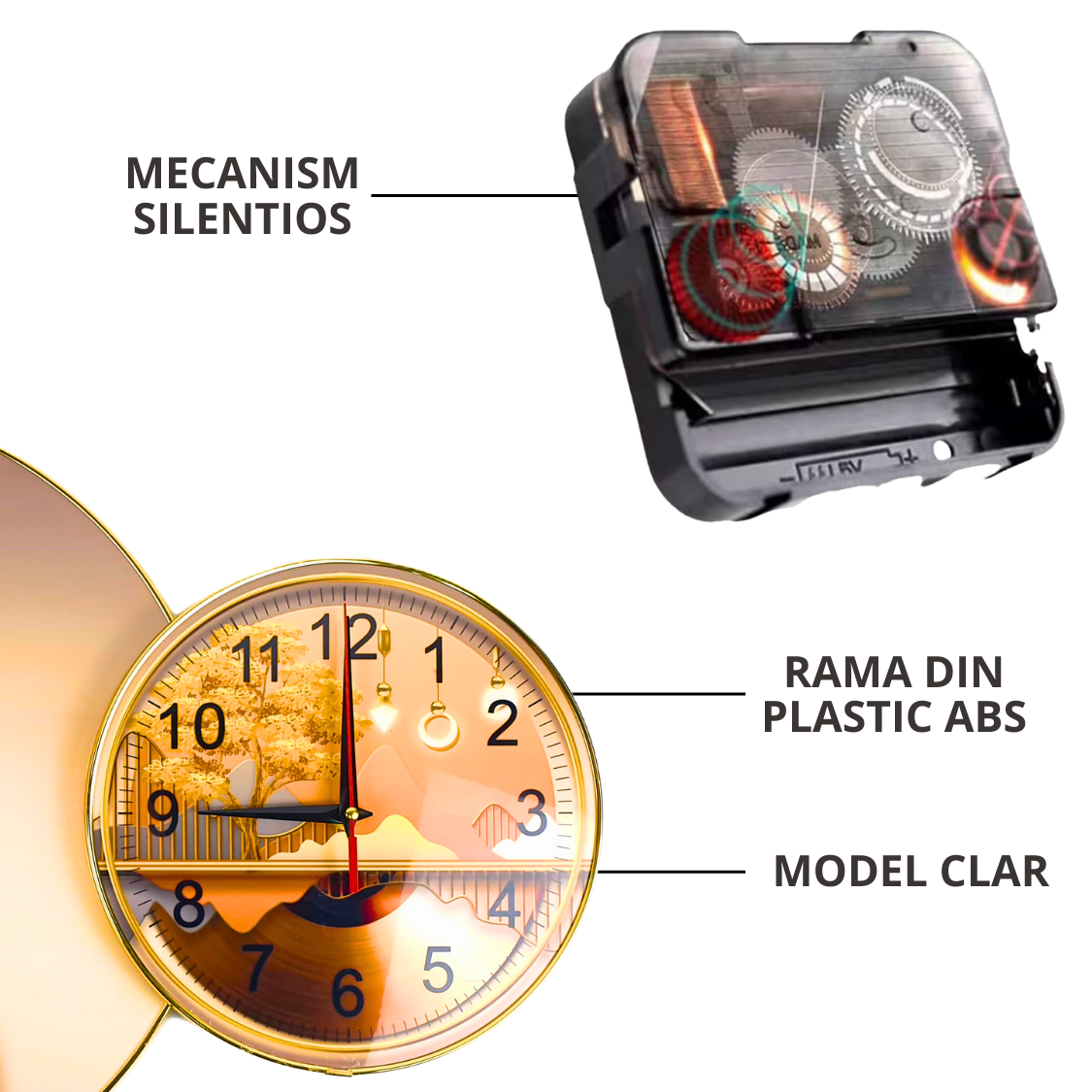 O alta caracteristica importanta este montarea simpla pe perete. Majoritatea modelelor vin cu un sistem de prindere stabil, astfel incat sa poti fixa ceasul in siguranta. Indiferent daca vrei sa-l amplasezi la nivelul ochilor sau mai sus, montajul este rapid, iar rezultatul este unul de efect. Poti alege sa il pozitionezi in apropierea unor piese de mobilier cheie (birou, biblioteca, canapea) sau sa il transformi in piesa centrala a camerei. Pentru un plus de armonie, incearca sa-l asortezi cu alte decoratiuni cu accente aurii, argintii sau culori complementare modelului ales.