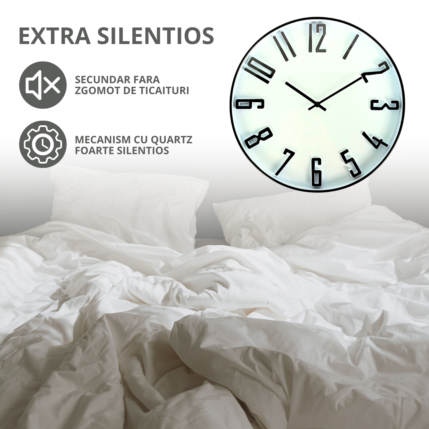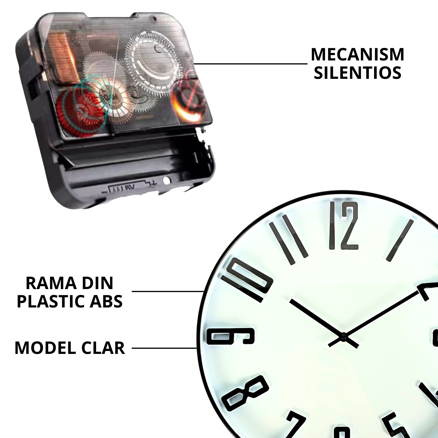 ✨ Ceasul de perete de 40 cm este alegerea perfecta pentru oricine cauta un accesoriu decorativ practic, modern si… incredibil de silentios. Construit cu un mecanism quartz extra silentios – fara zgomotul sacaitor de ticaieli – acest model transforma orice camera intr‑un spatiu relaxant, fie ca vorbim despre dormitor, living sau birou. Cifrele 3D supradimensionate, decupate in negru profund, creeaza un contrast puternic pe suprafata alba si lucioasa, oferind citire rapida chiar si de la distanta.