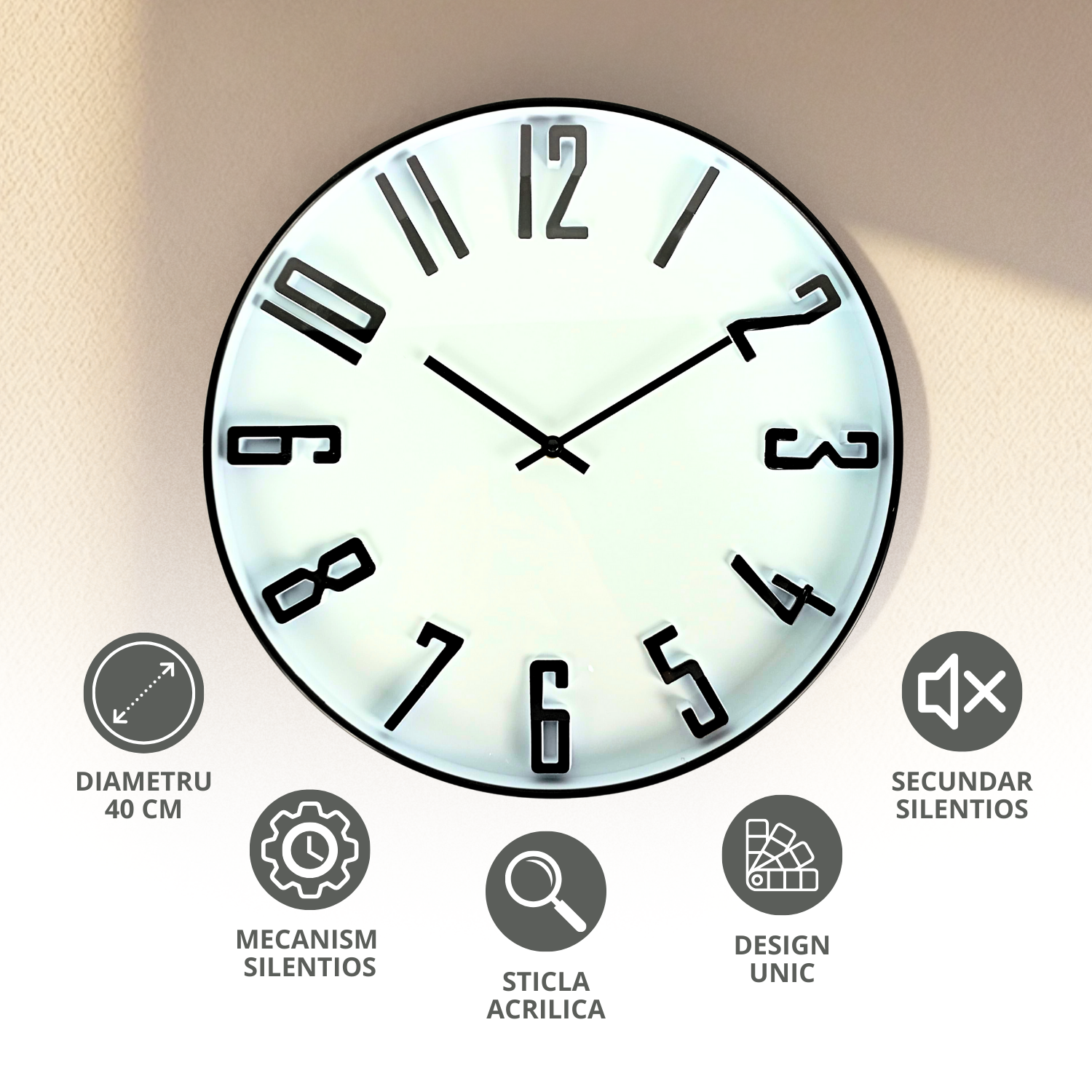 Investeste intr‑un ceas de perete de 40 cm cu mecanism quartz silentios, creat pentru a combina designul minimalist cu fiabilitatea de lunga durata. Cifrele 3D negre, sticla acrilica rezistenta si rama ABS durabil transforma acest model intr‑o alegere inteligenta pentru orice locuinta moderna. Comanda‑l astazi si bucura‑te de o ambianta mai linistita, un stil impecabil si o citire a orei la superlativ!