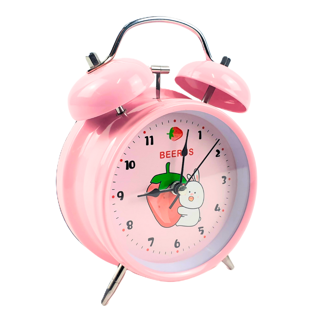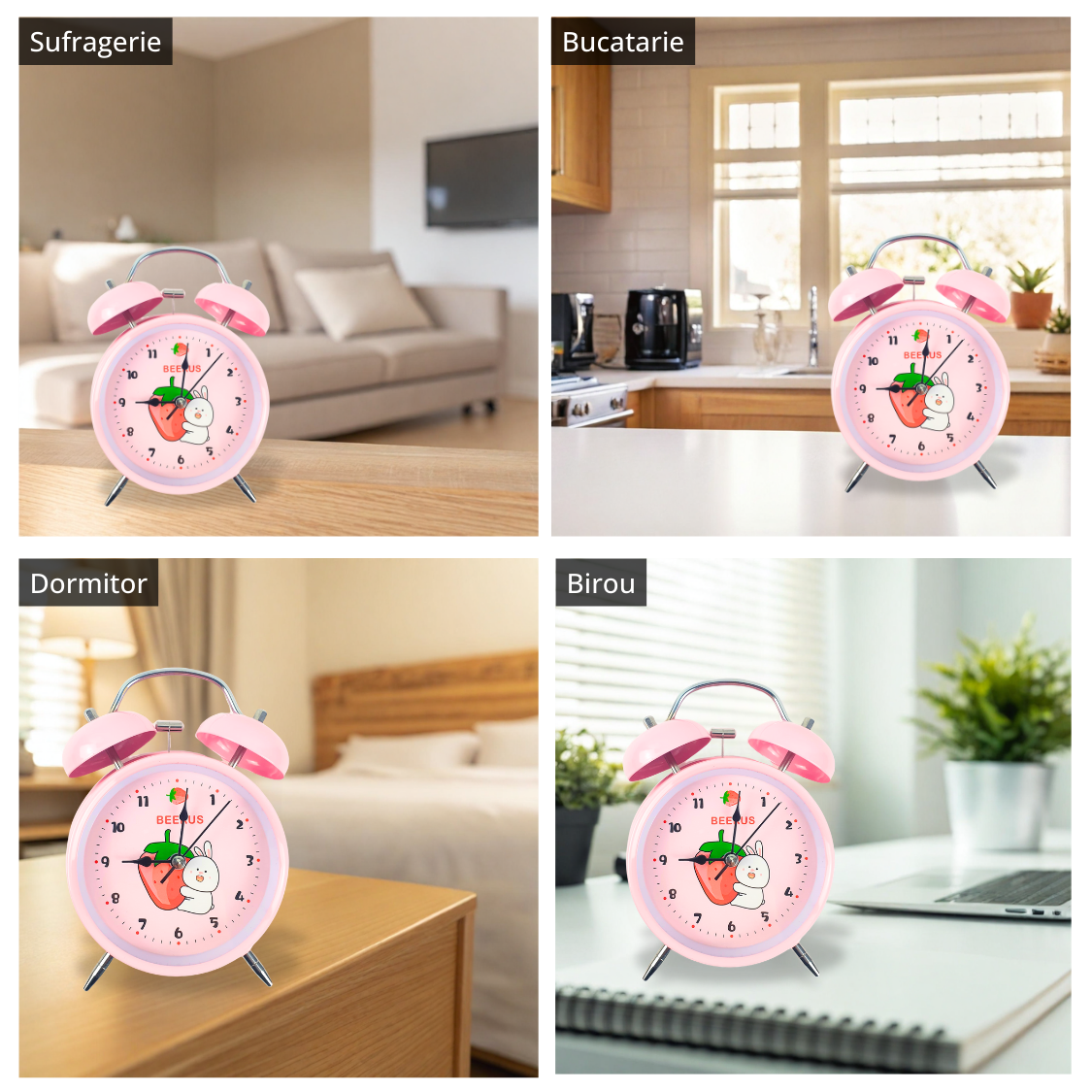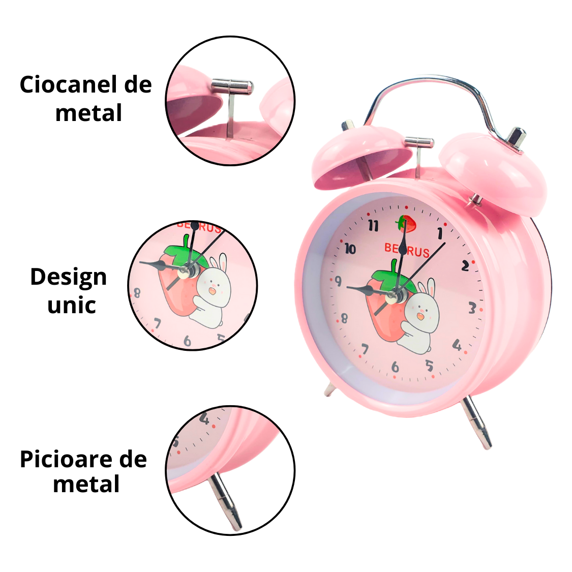 Designul este cu siguranta unul dintre punctele forte ale acestui ceas desteptator. Carcasa metalica rezistenta, forma clasica tip “clopotel” si fundalul ilustrat cu animalute dragalase alaturi de legume si fructe colorate ii confera un aer jucaus. Fiecare nuanta – de la roz si albastru la verde sau crem – este aleasa pentru a fi in armonie cu tematica simpatica. Caracterele de pe cadran (precum un ursulet langa o leguma sau un iepuras langa un fruct) dau personalitate ceasului si transforma rutina zilnica intr-o experienta mai placuta. Mai mult, aspectul sau decorativ il face usor de integrat in orice tip de incapere: camera copiilor, birou, sufragerie sau chiar intr-un magazin de cadouri.