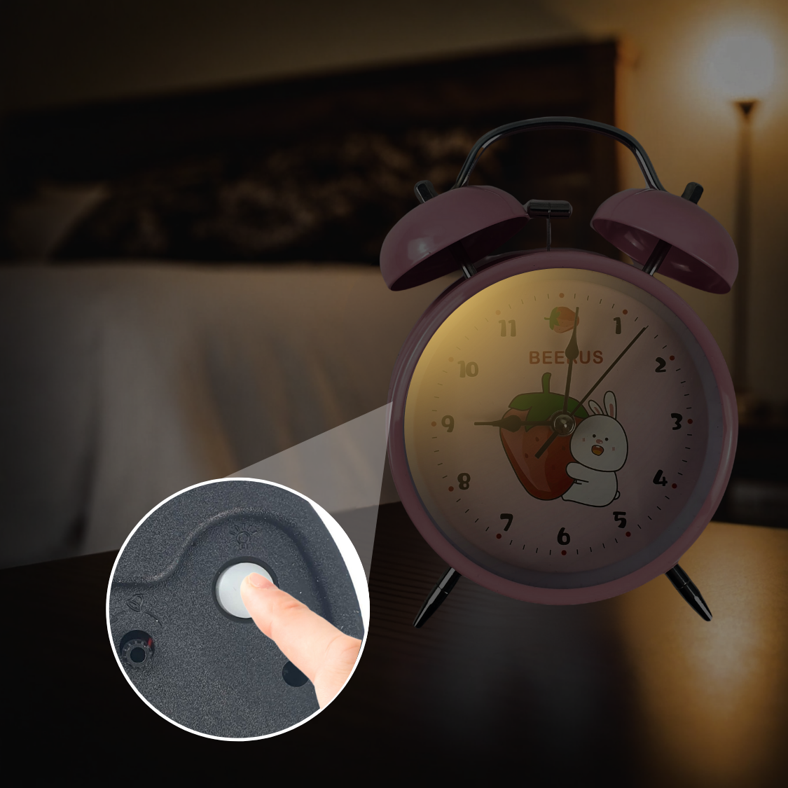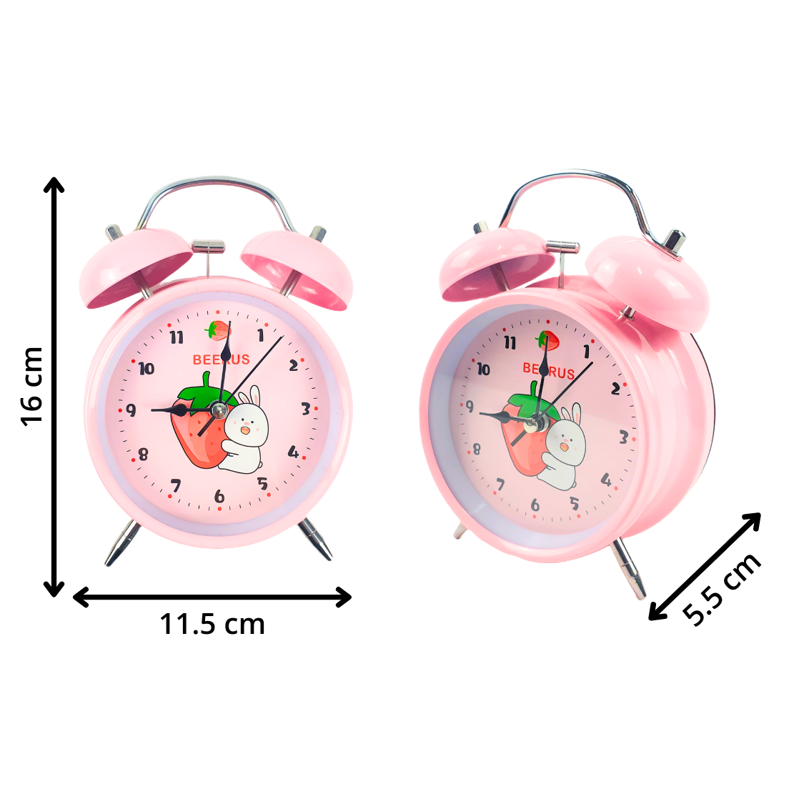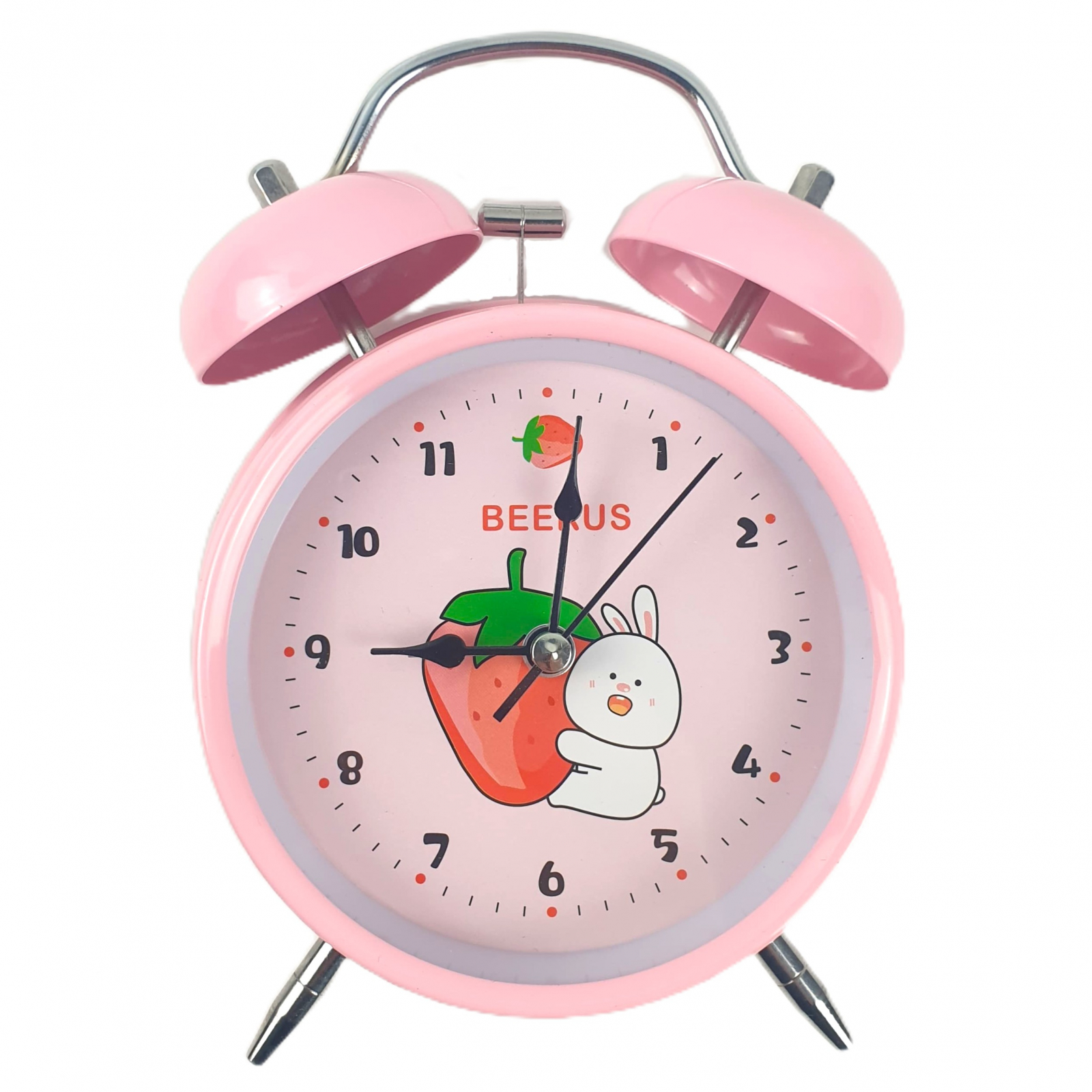 Designul este cu siguranta unul dintre punctele forte ale acestui ceas desteptator. Carcasa metalica rezistenta, forma clasica tip “clopotel” si fundalul ilustrat cu animalute dragalase alaturi de legume si fructe colorate ii confera un aer jucaus. Fiecare nuanta – de la roz si albastru la verde sau crem – este aleasa pentru a fi in armonie cu tematica simpatica. Caracterele de pe cadran (precum un ursulet langa o leguma sau un iepuras langa un fruct) dau personalitate ceasului si transforma rutina zilnica intr-o experienta mai placuta. Mai mult, aspectul sau decorativ il face usor de integrat in orice tip de incapere: camera copiilor, birou, sufragerie sau chiar intr-un magazin de cadouri.