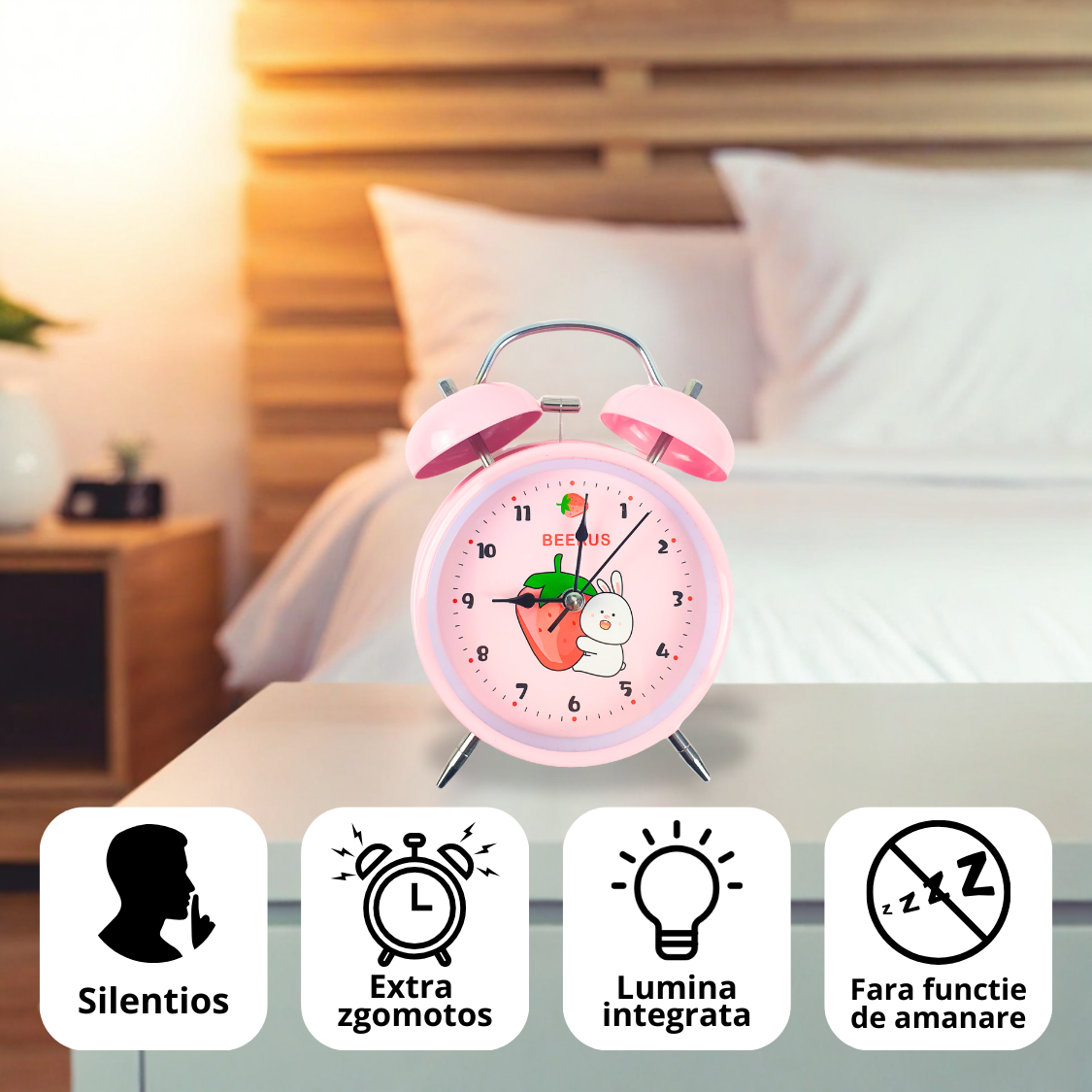 Ceas Desteptator Clasic Analog, Iluminare Interioara, Design cu Animalute si Fructe, Mecanism Silentios si Lumina, Alimentare pe baterii AA