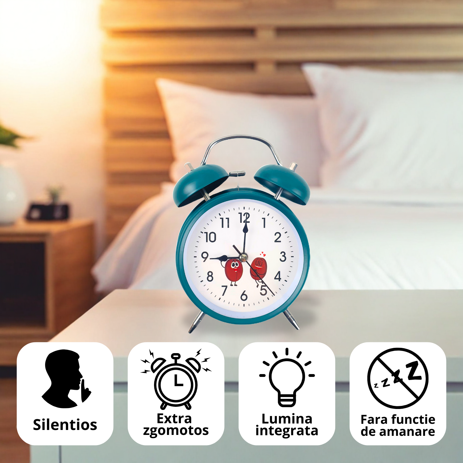 Ceas desteptator cafea cu mecanism silentios, lumina si design retro pentru iubitorii de cafea.