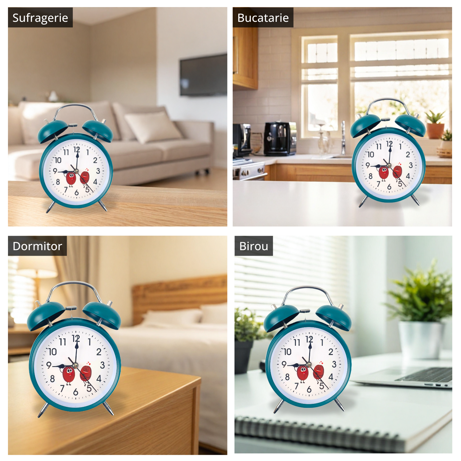 Acest model se remarca prin aspectul retro cu clopote metalice, oferindu-ti un aer clasic si un decor inedit in incapere. Afișajul clar si luminos te ajuta sa citesti ora cu usurinta, iar sistemul de lumina inclus este util in conditii de intuneric sau lumina redusa, astfel incat sa verifici ora fara a fi nevoie sa aprinzi veioza. ♻️ Designul cu motive de cafea face ca acest ceas sa fie un cadou minunat pentru oricine iubeste sa savureze o cafea calda la primele ore ale diminetii. ☀️