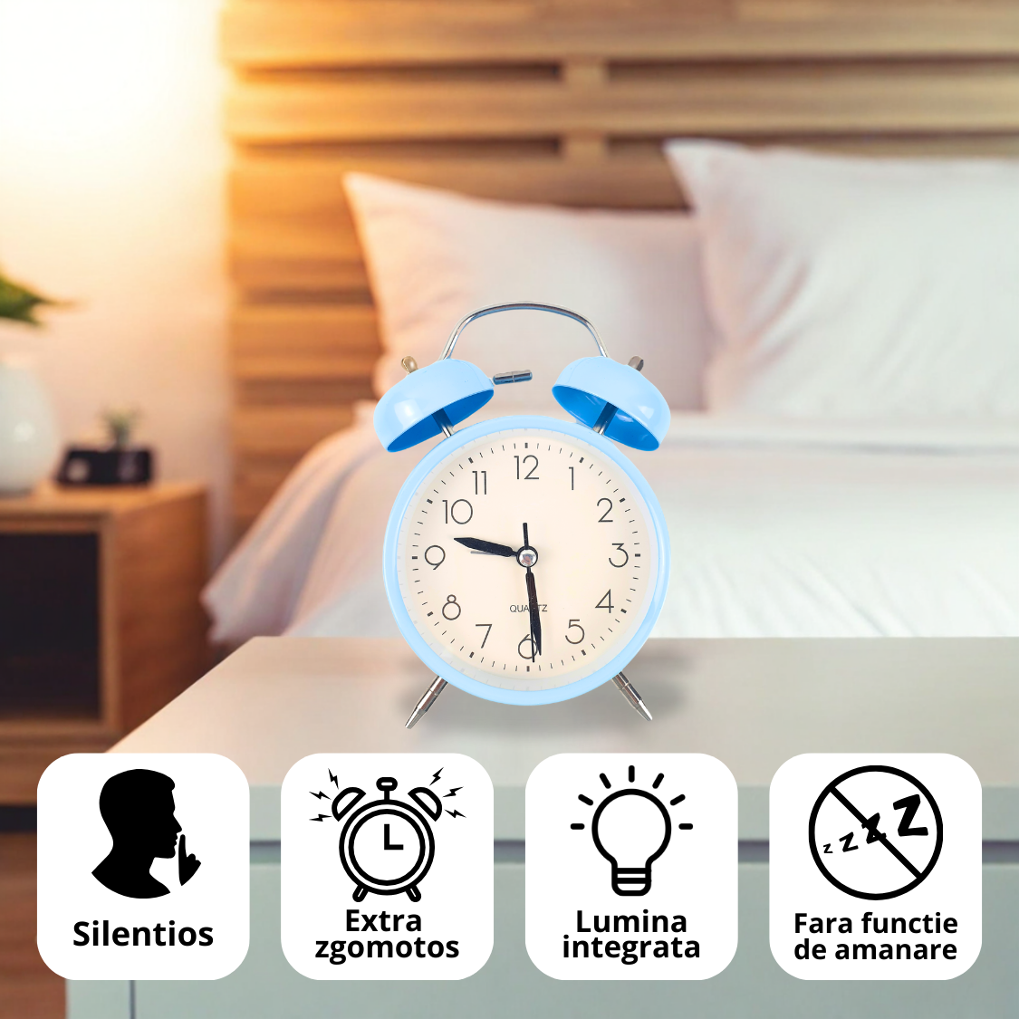 De la accentul clasic dat de clopotele metalice, pana la lumina integrata care face citirea orei mai usoara, fiecare detaliu a fost gandit pentru a satisface nevoile zilnice ale unui utilizator modern, dar pasionat de elemente retro. Achizitioneaza acum acest ceas desteptator cu lumina si pregateste-te sa incepi fiecare zi cu un zambet, stiind ca ai o solutie simpla si de incredere pentru trezirea matinala.
