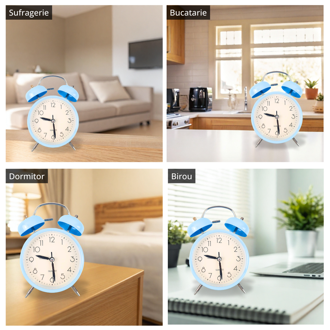 - Tip ceas: Analogic, cu 2 clopote metalice si maner superior