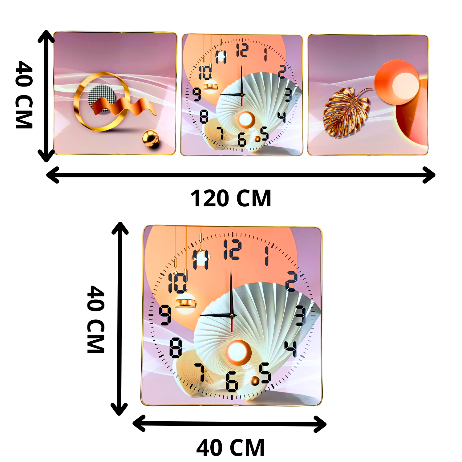 Descopera ceasul panorama perfect pentru a-ti transforma peretele intr-un veritabil punct de atractie! Acest set modern contine trei piese individuale, fiecare masurand 40 x 40 cm, ceea ce inseamna ca vei avea o compozitie impresionanta de 120 x 40 cm atunci cand le asezi una langa cealalta. Fiecare piesa prezinta un design artistic deosebit, inspirat de natura sau forme abstracte, punand in valoare culori vii si accente aurii, dar si elemente ce sugereaza calmul si armonia ✨.