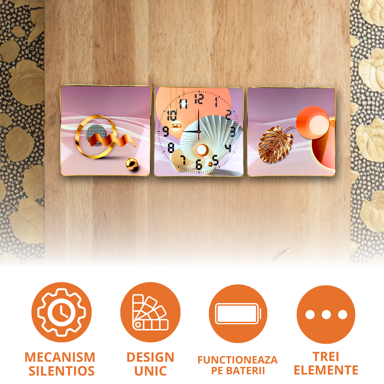 ✅ Set complet de 3 bucati: Doua panouri decorative si un panou central cu cadran de ceas.