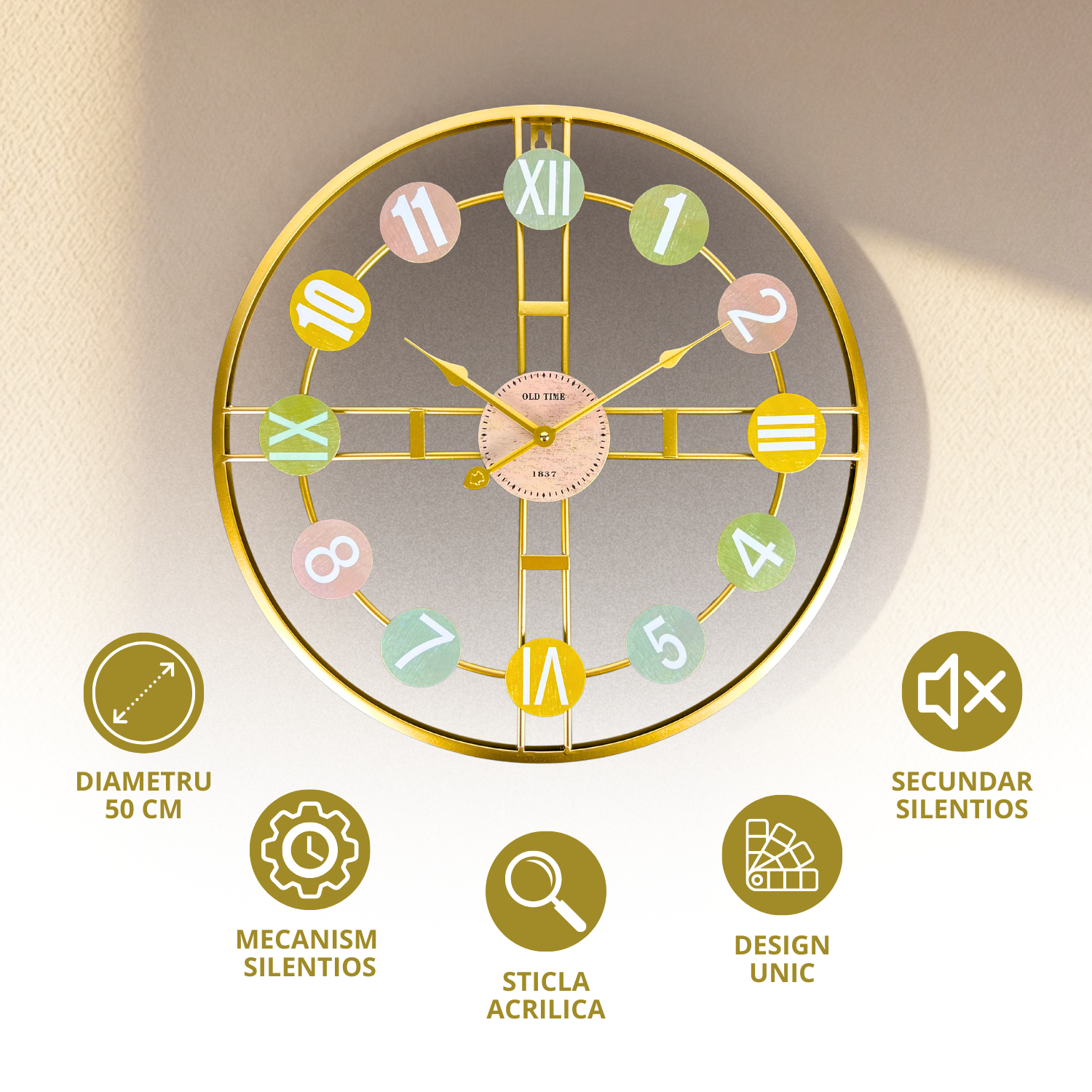 Dimensiuni ideale pentru orice incapere – Cu un diametru generos de 50 cm si o grosime de doar 3 cm, acest ceas reuseste sa atraga privirile fara a incarca spatiul. Este suficient de mare pentru a fi vizibil de la distanta, dar mentine un aspect aerisit si elegant pe perete.