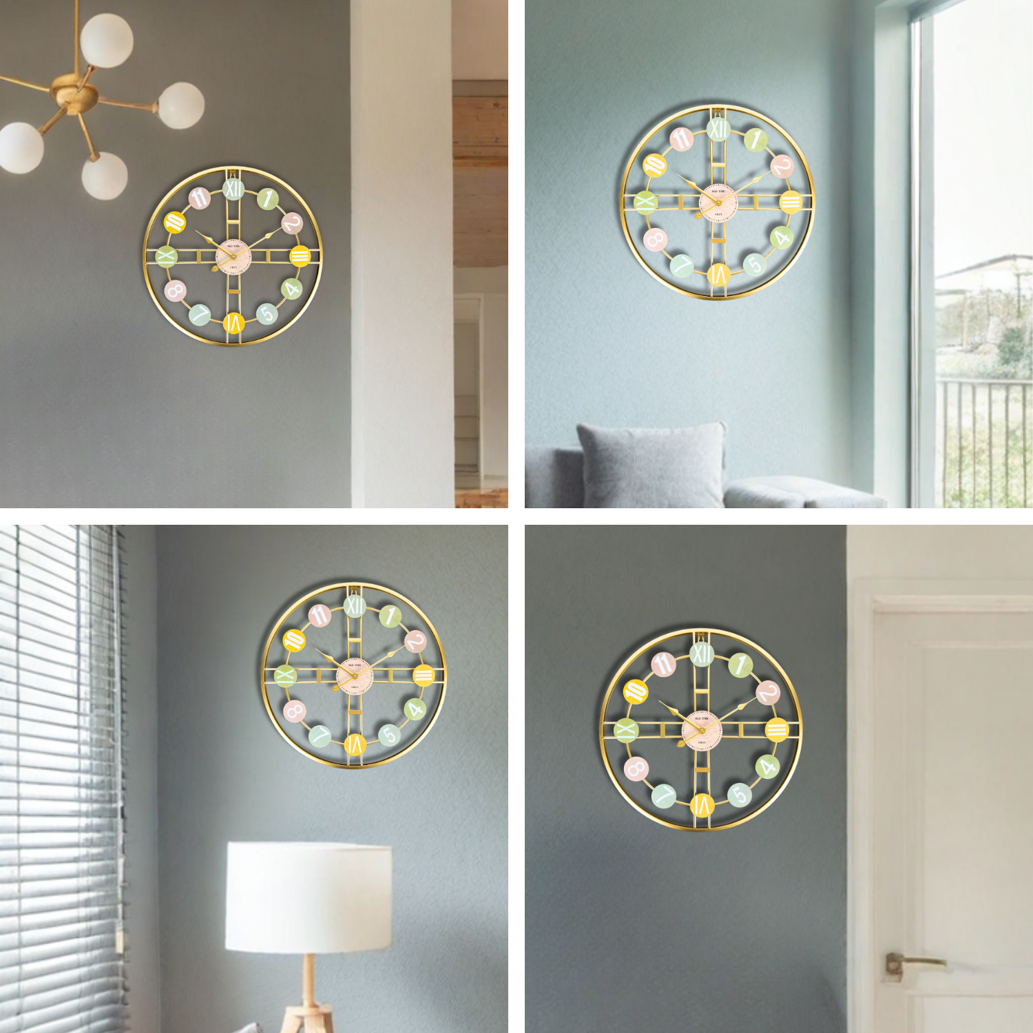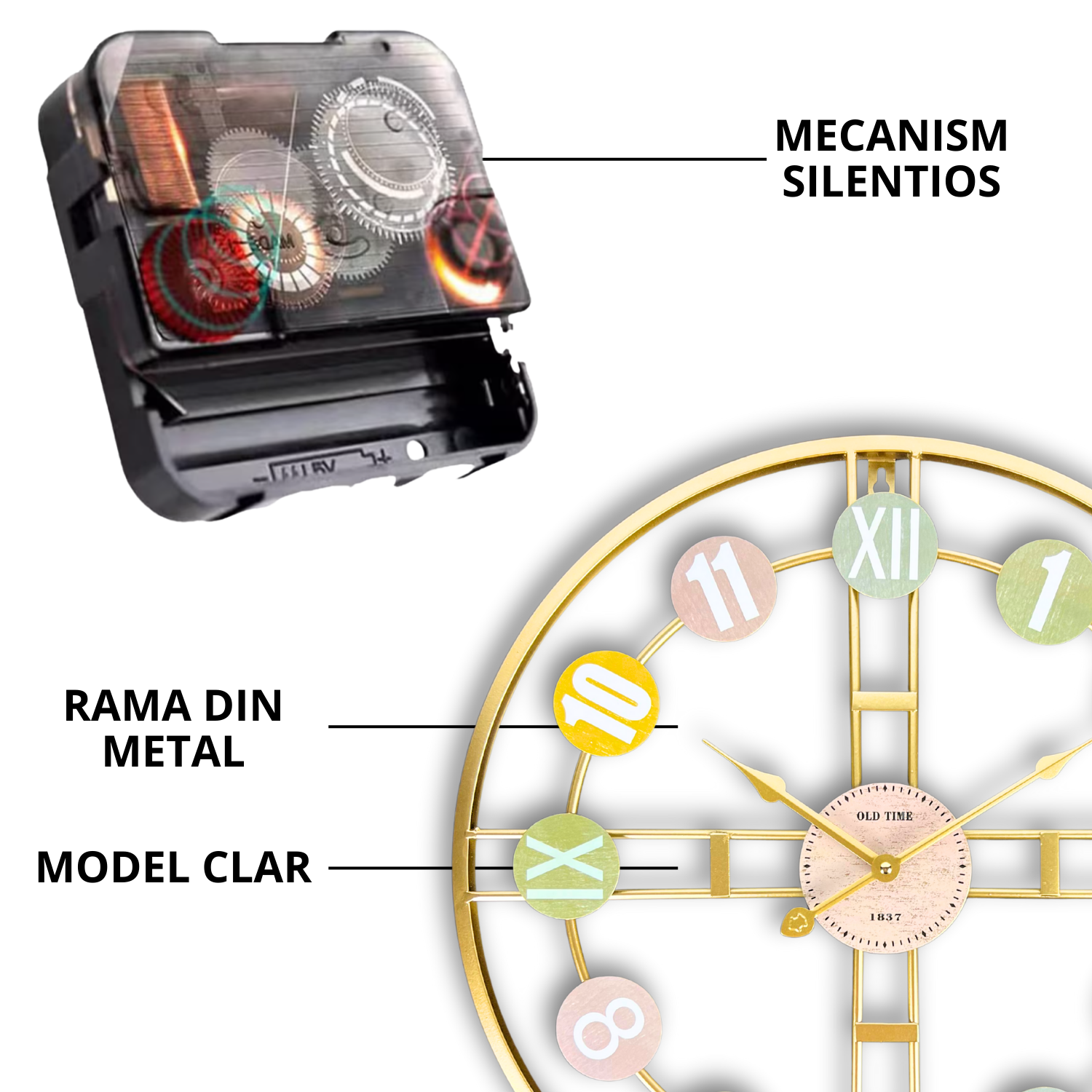 Design modern si decorativ – Cadranul rotund cu cifre mari, colorate si vizibile ofera un aer jovial si totodata sofisticat. Rama din metal adauga un plus de rezistenta, iar structura minimalista il face potrivit atat pentru spatii moderne, cat si pentru decoruri vintage.