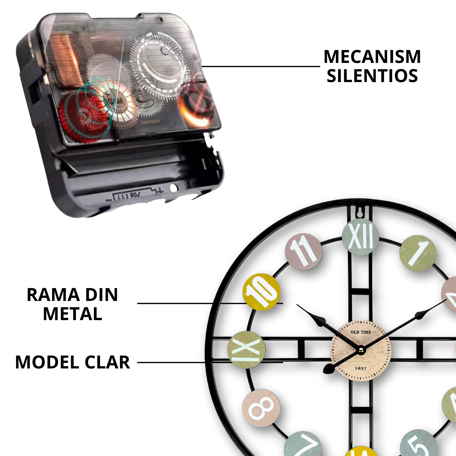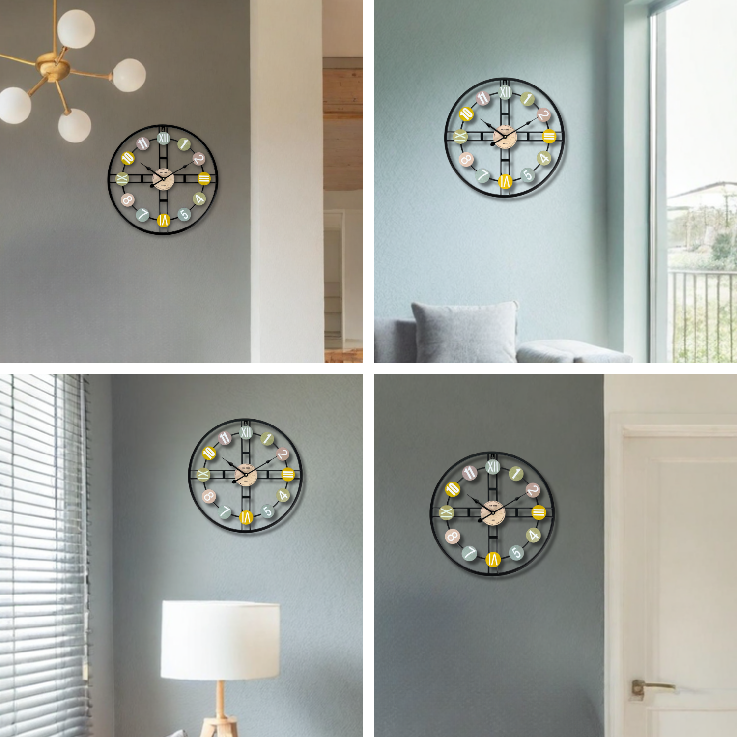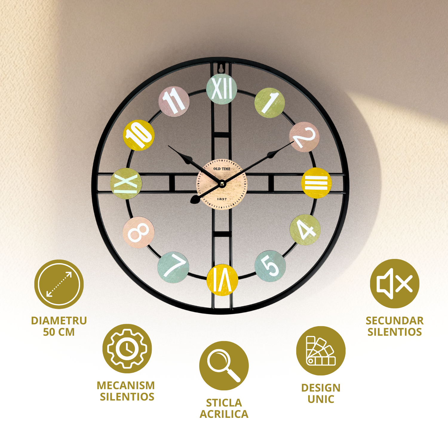 ✅ Design modern si decorativ – Cadranul rotund cu cifre mari, colorate si vizibile ofera un aer jovial si totodata sofisticat. Rama din metal adauga un plus de rezistenta, iar structura minimalista il face potrivit atat pentru spatii moderne, cat si pentru decoruri vintage.