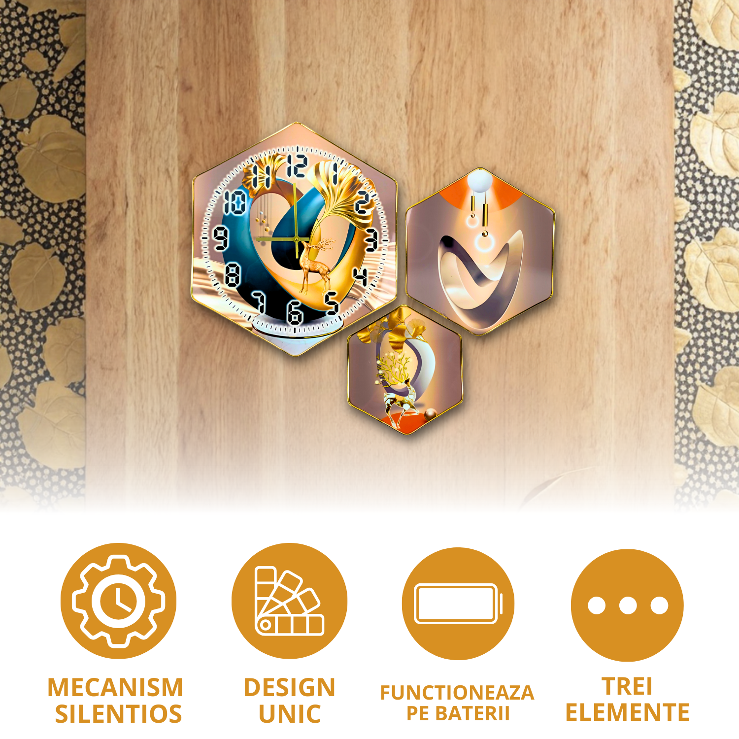 Datorita formelor de tip romb sau hexagon, acest ceas de perete este mai mult decat un simplu instrument pentru masurarea timpului – este o piesa de arta. Fiecare dintre cele 3 elemente are un design diferit, inspirat din tendintele actuale de decor interior, pentru a-ti oferi un aspect echilibrat si rafinat. De la formele abstracte, la detalii florale sau motive inspirate din natura, aceste piese creeaza un ansamblu placut ochiului, care se potriveste perfect in camere cu diverse stiluri: minimalist, scandinav, clasic sau chiar industrial. ✨
