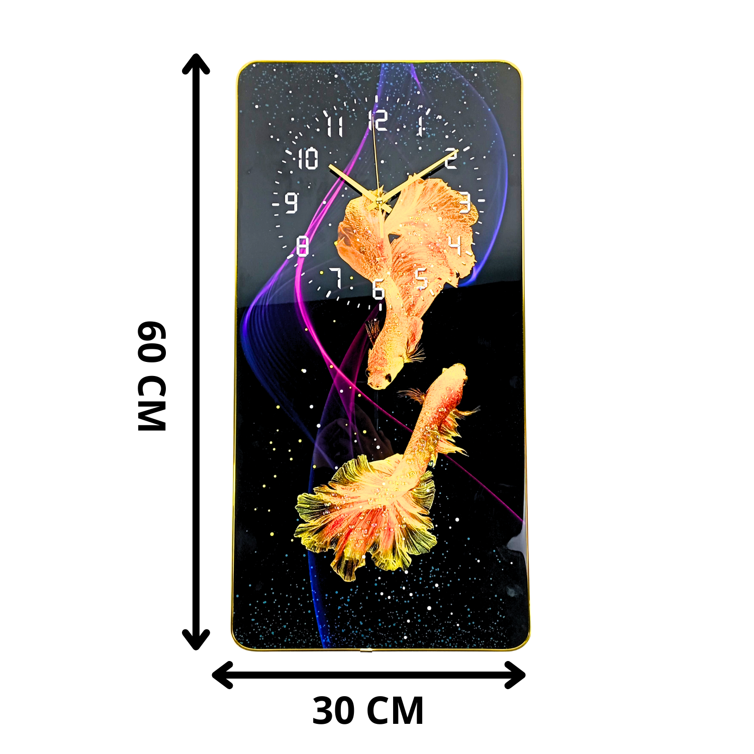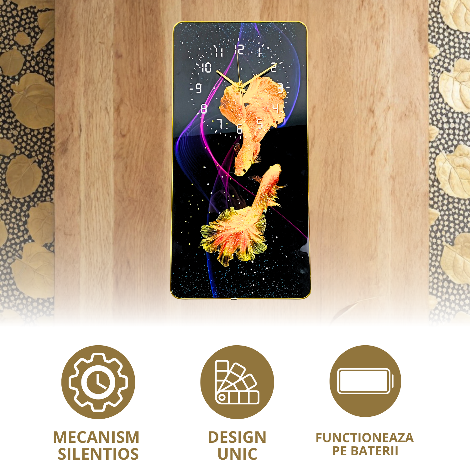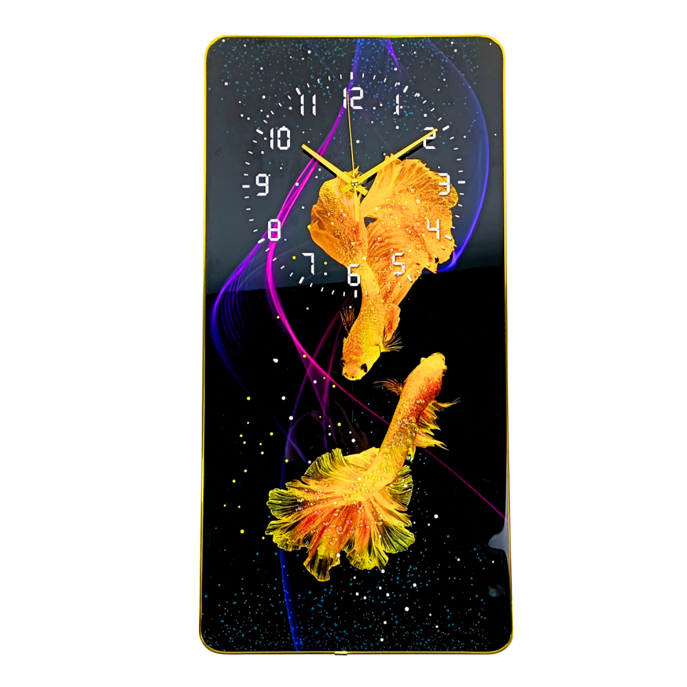 Descopera farmecul unui tablou cu ceas unic, perfect pentru a-ti completa decorul interior si pentru a aduce un strop de rafinament in orice incapere. Acest design deosebit, cu pestisori aurii care danseaza intr-un joc fascinant de culori, atrage privirile si creeaza o atmosfera linistita si primitoare. Dimensiunile de 60 x 30 cm il fac ideal atat pentru living, cat si pentru birou, dormitor sau orice alt spatiu care are nevoie de un plus de personalitate. Indiferent daca esti pasionat de arta moderna sau iti place un stil minimalist, acest tablou cu ceas aduce echilibrul perfect intre functionalitate si estetica. 🐠🕒