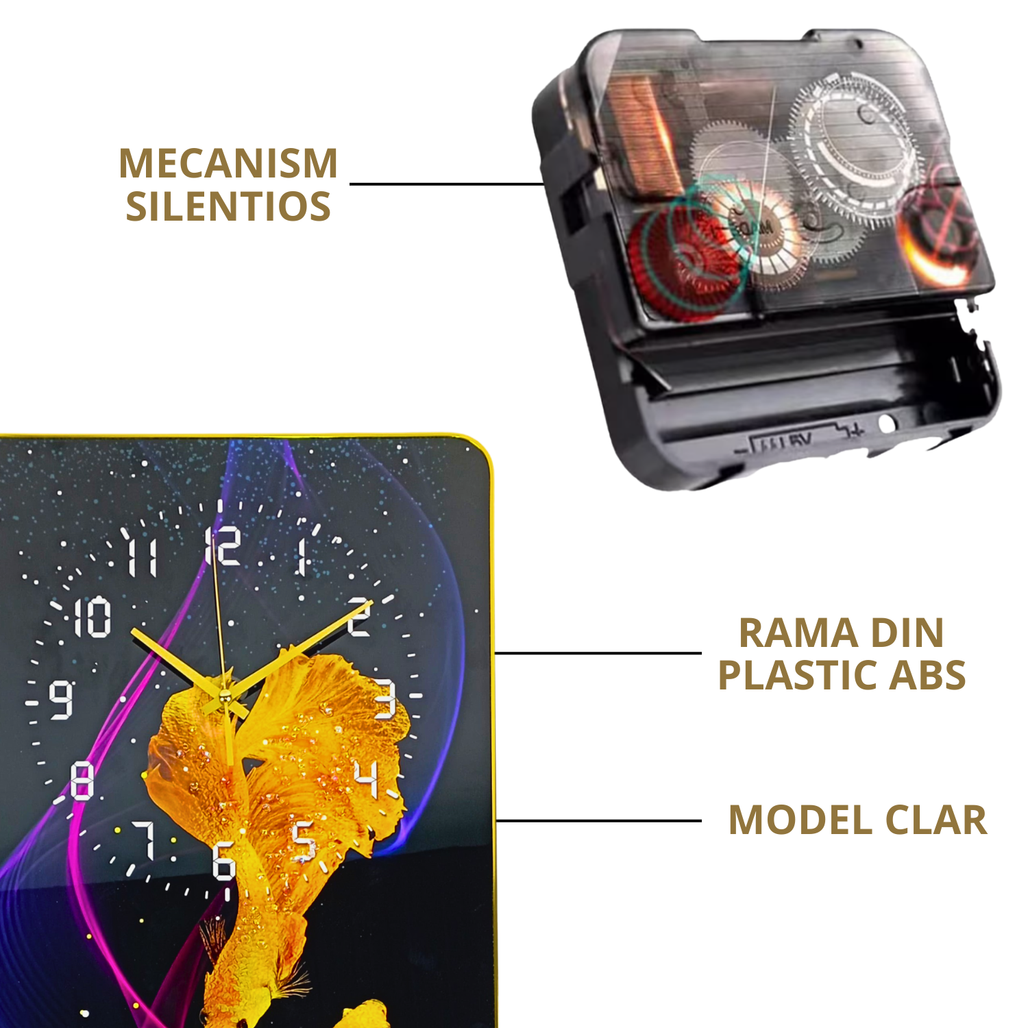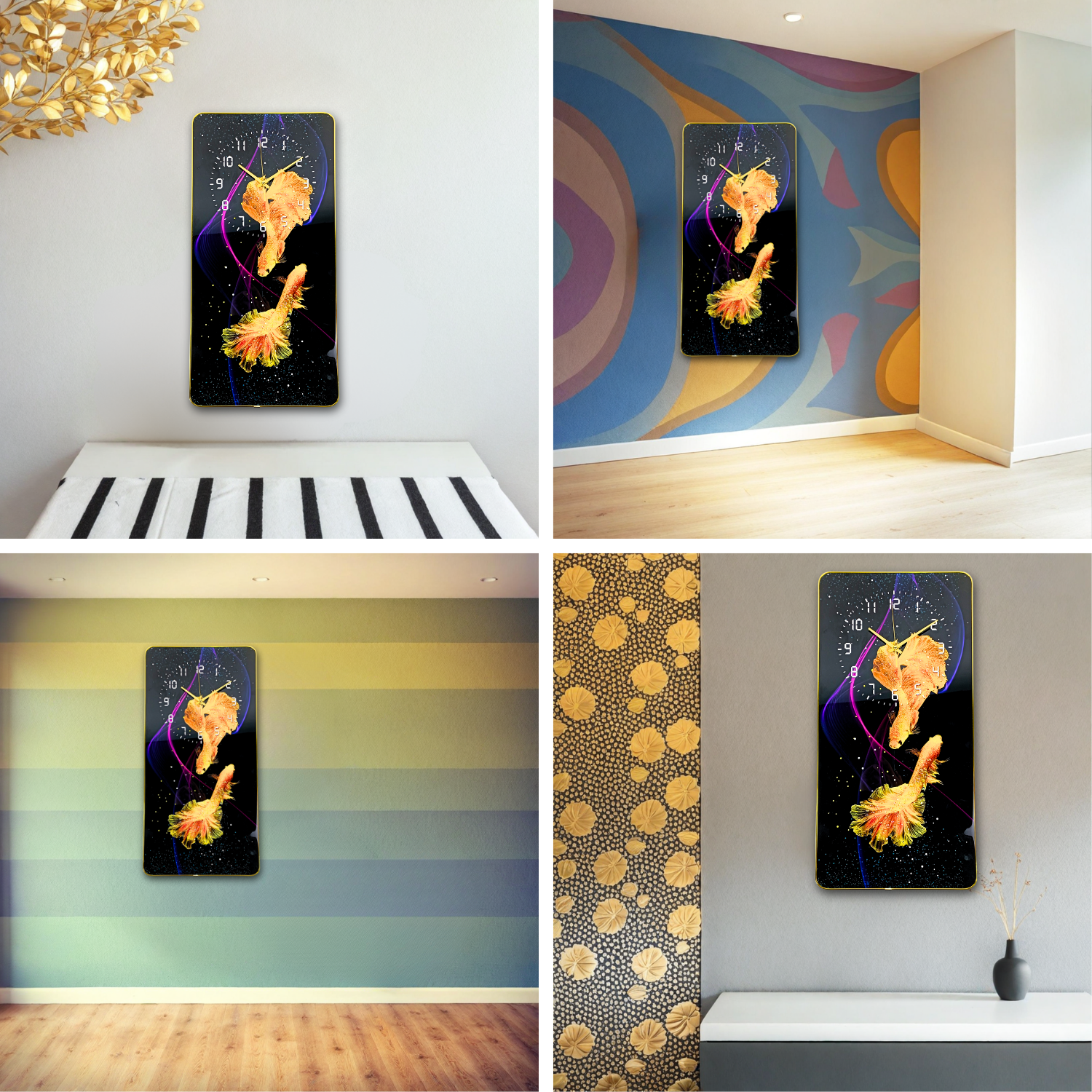 Conceput pentru a incanta privirea si a mentine un aer de eleganta, Tablou cu Ceas 60 x 30 – Design Modern cu Pestisori Aurii se potriveste perfect in locuintele iubitorilor de decoruri artistice, dar si in spatii comerciale, precum receptii sau cafenele cu tematica. Interpretarea moderna a pestisorilor aurii simbolizeaza prosperitatea, norocul si armonia, aducand un sentiment de relaxare si inspiratie. Este usor de asortat cu mobilier in culori neutre, dar poate fi si un accent care contrasteaza placut cu pereti de culori vibrante. 🌟