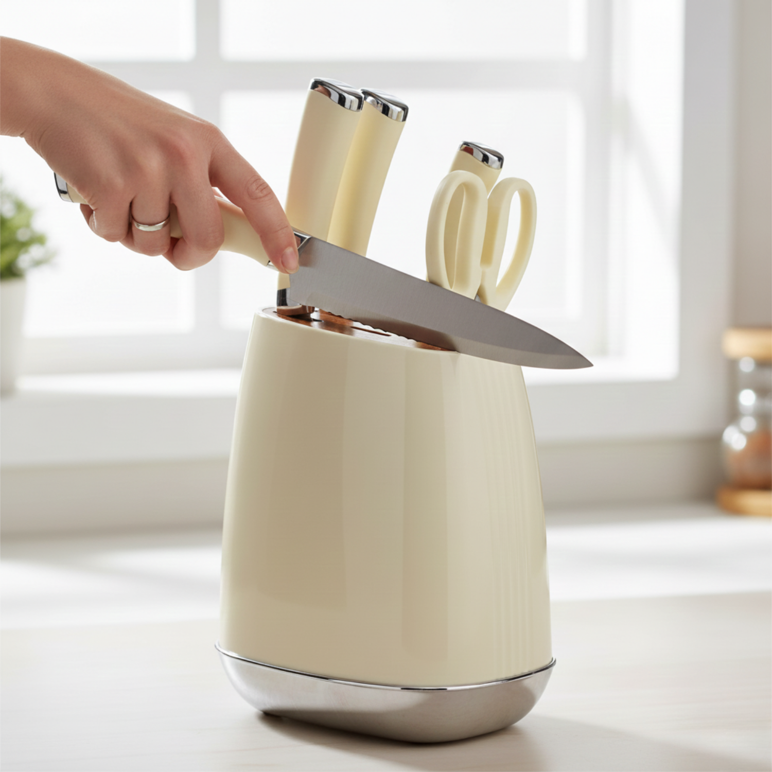 ✅ Aspect elegant – Blocul suport crem lucios cu baza metalica adauga un accent de stil pe blatul tau, potrivindu-se perfect in orice tip de bucatarie – clasica sau moderna.
