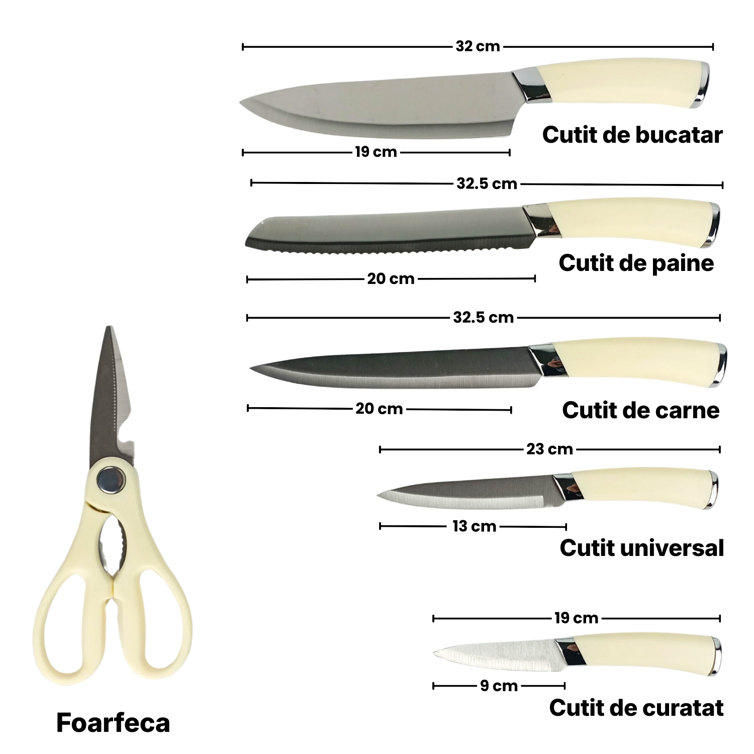 Continut pachet: 1 x Suport cutite 1 x Foarfeca 5 x Cutite bucatarie