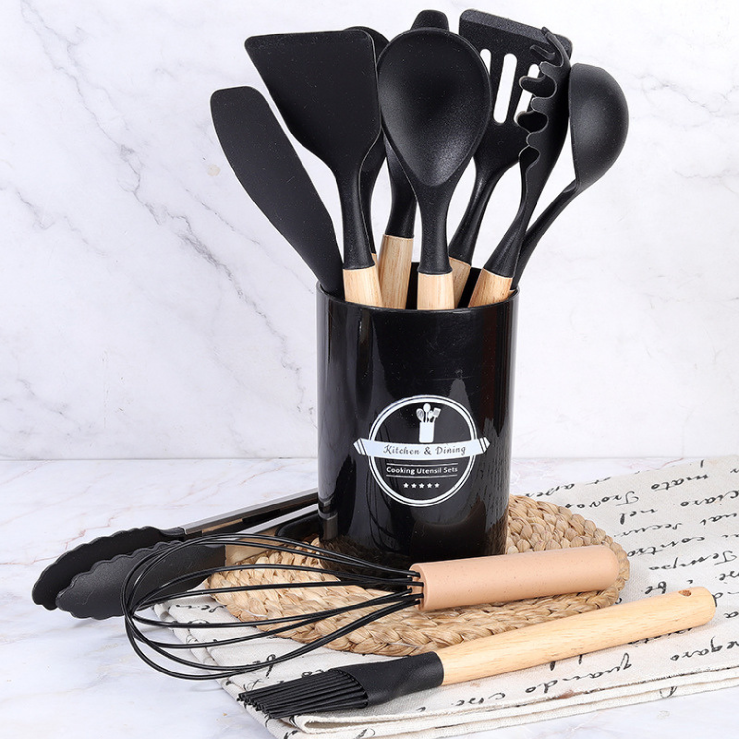 Set ustensile bucatarie 11 piese cu suport, cutite, accesorii si ustensile din silicon rezistent la caldura, Negru