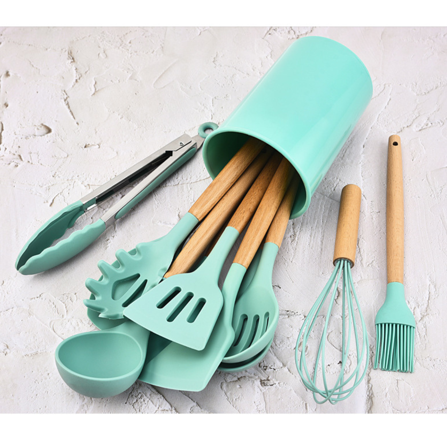 Set ustensile bucatarie 11 piese cu suport, cutite, accesorii si ustensile din silicon rezistent la caldura