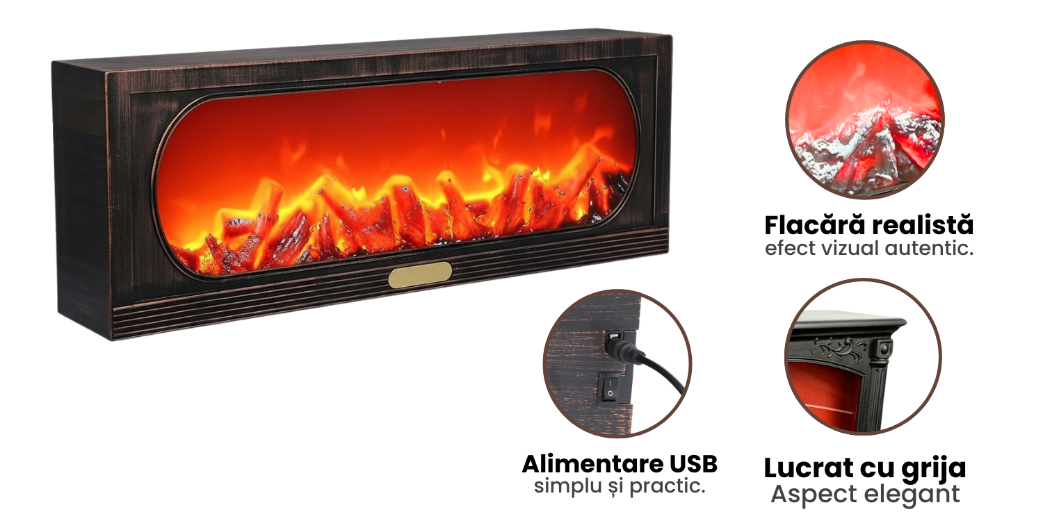 Transforma orice incapere intr-un colt de relaxare si atmosfera de sarbatoare cu Semineul decorativ vintage LED, un accesoriu modern si elegant ce aduce caldura vizuala in caminul tau. Creat pentru a imita efectul flacarilor reale, acest semineu ofera o lumina ambientala placuta, fara a genera caldura, fiind astfel o alegere sigura si versatila pentru orice spatiu. ✨