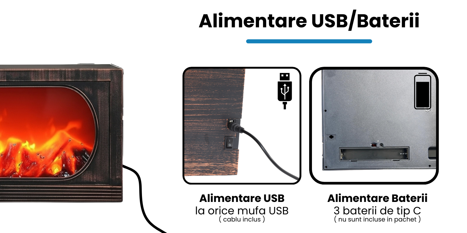 Semineul este echipat cu alimentare USB (cablu inclus), ceea ce permite conectarea la orice adaptor, laptop sau sursa de energie portabila. De asemenea, functioneaza si cu 3 baterii de tip C (nu sunt incluse in pachet), oferindu-ti flexibilitate maxima in utilizare, chiar si in spatii fara acces la priza.