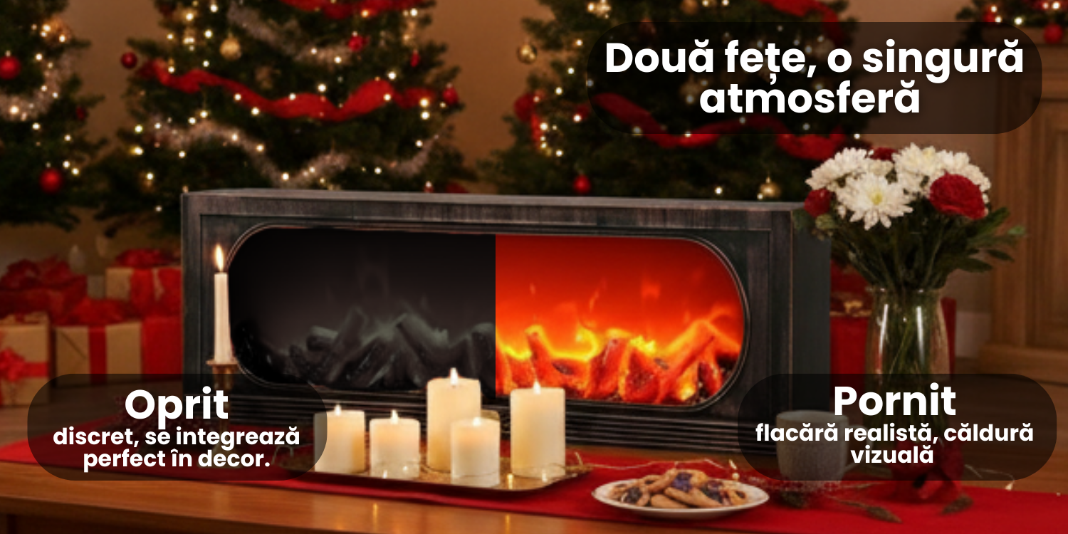 Iluminarea LED creeaza un efect vizual autentic de jar si flacari, aducand senzatia de foc aprins in camin. Lumina calda transforma atmosfera camerei, oferind un sentiment de confort, relaxare si eleganta ⭐. Ideal pentru seri linistite, momente romantice sau decorul festiv de Craciun ori Halloween.