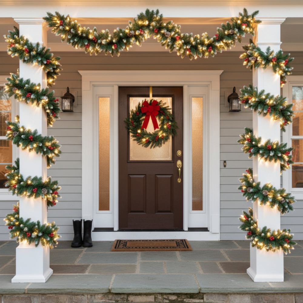 Utilizare la interior si exterior acoperit. Pe semineu creeaza un cadru primitor pentru serile in familie; la exterior, pe prispa sau sub terasa, adauga o nota festiva vizibila de la distanta. In combinatie cu o coronita pe usa, se obtine o intrare unitara, bine definita, cu linii coerente de sus pana jos.