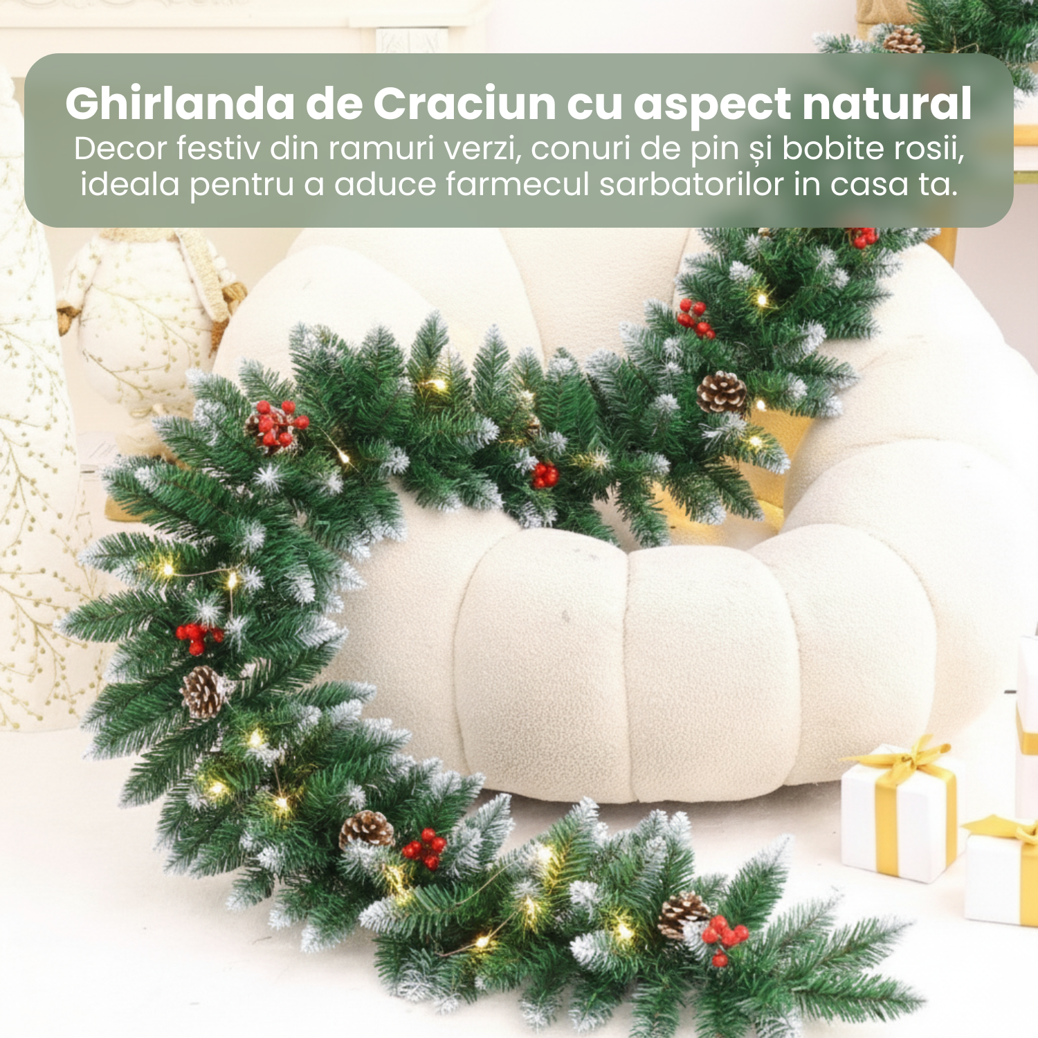 Ghirlanda de Craciun, 270 cm, cu merisoare si conuri, Lumini LED, ornamente de craciun, din brad artificial, decoratiune craciun