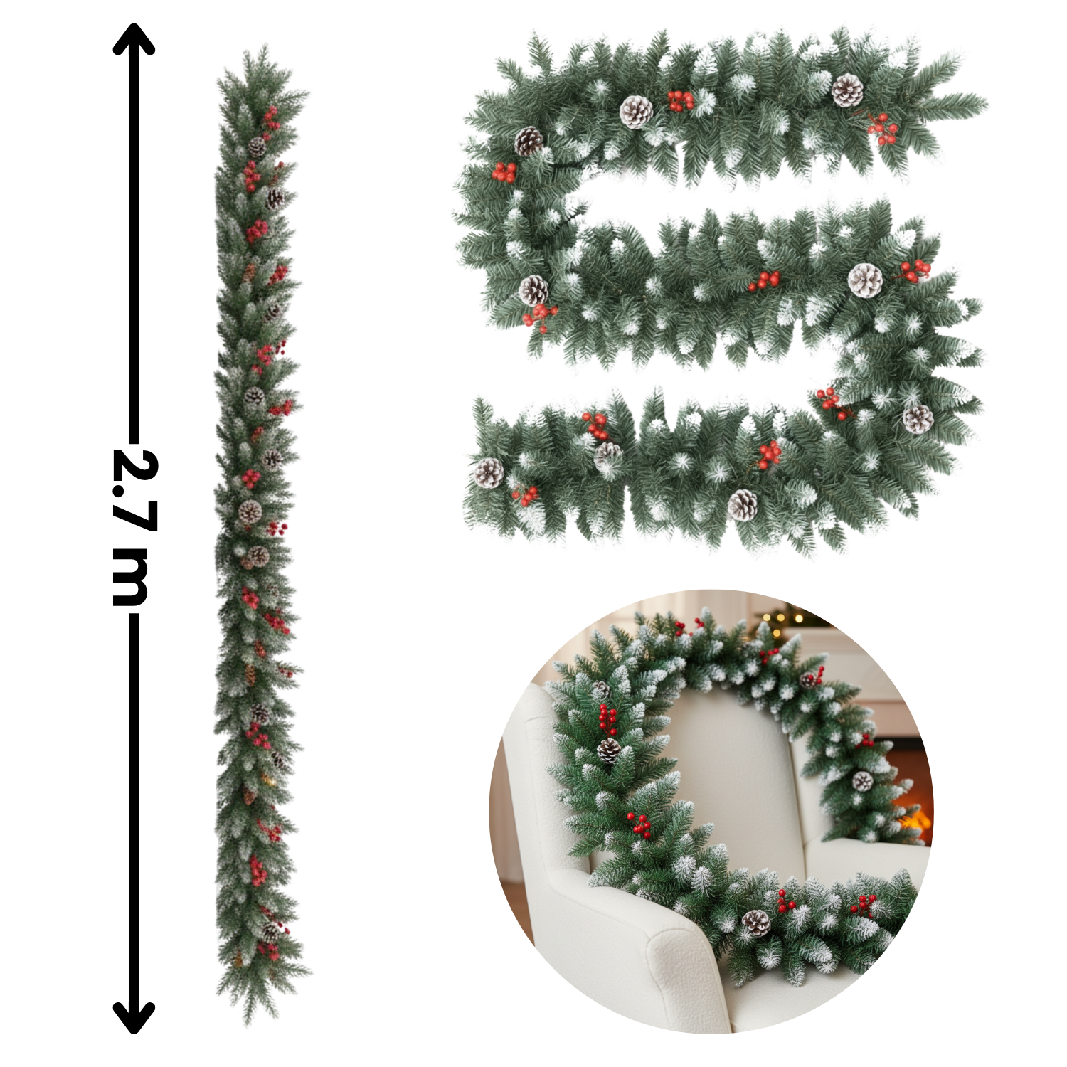 1 x Ghirlanda de Craciun, lungime 2.7 m, verde cu efect zapada, cu conuri decorative si bobite rosii