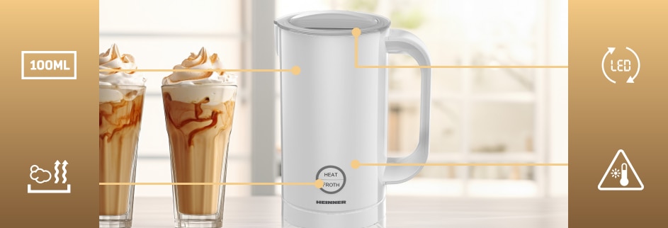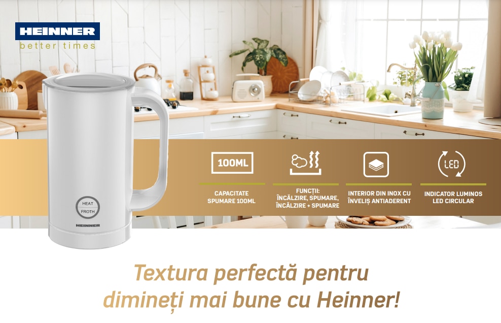 Aparat pentru spumat laptele Heinner HMFR-450WH, 450w, capacitate spumare: 100ml, 4 functii, capacitate incalzire: 200ml, led, inel spumare magnetic, alb