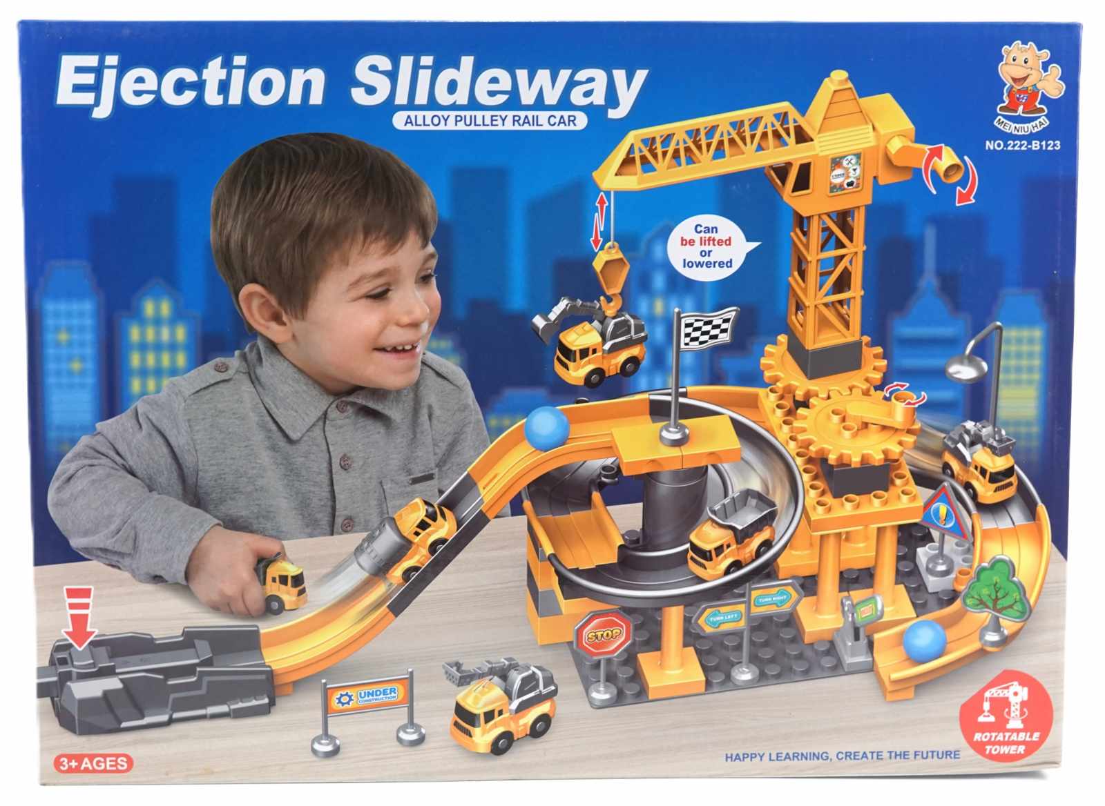 Inca de la prima vedere, vei remarca structura Ejection Slideway, care permite masinutelor sa fie lansate pe sina cu ajutorul unui mecanism tip catapulta. Intregul sistem cu scripete functioneaza ca intr-un santier de constructii real, oferind o experienta de joc captivanta si realista. Prin manevrarea macaralei, a sina de rulare si a diferitelor masinute, copiii invata in mod practic despre mecanisme de ridicare, despre cum functioneaza un scripete si cum se deplaseaza masinile pe piste curbe sau in panta. Micul tau inginer se va bucura sa experimenteze efectul de viteza atunci cand masina este lansata pe traseu, iar zambetul sau va fi pe masura distractiei. 🚗