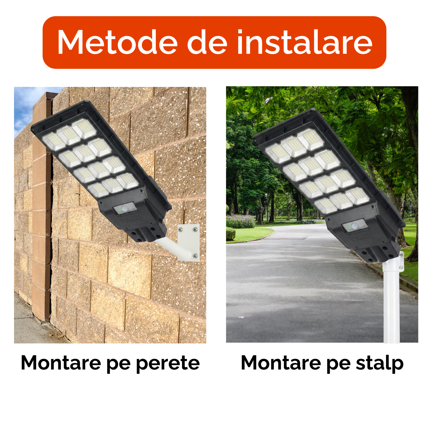 Corpul lămpii este realizat din aluminiu rezistent la coroziune, proiectat să reziste ani la rând. Cu indicele de protecție IP67, lampa este complet protejată contra prafului și a ploii torențiale. O poți monta rapid pe un perete sau stâlp cu ajutorul suportului și accesoriilor incluse, fără cabluri și fără electrician. Pentru eficiență maximă, monteaz-o la o înălțime de ~4 m și orientează panoul solar către sud, astfel încât să primească cât mai mult soare pe parcursul zilei. LED-urile integrate au o durată de viață de peste 50.000 ore, astfel că nu vei fi nevoit să înlocuiești becuri ani de zile.