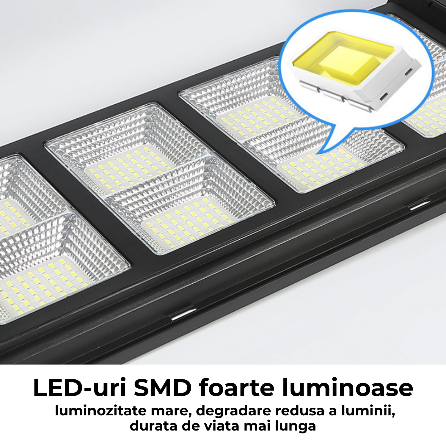 Descopera puterea iluminatului modern si economic cu lampa solara LED 300W, ideala pentru gradina, curte, alei sau zone publice. Proiectata pentru a oferi lumina puternica si constanta pe tot parcursul noptii, aceasta lampa combina cele mai noi tehnologii in materie de LED-uri, panouri solare si control inteligent, astfel incat sa beneficiezi de un iluminat de calitate, cu zero costuri la energie electrica.