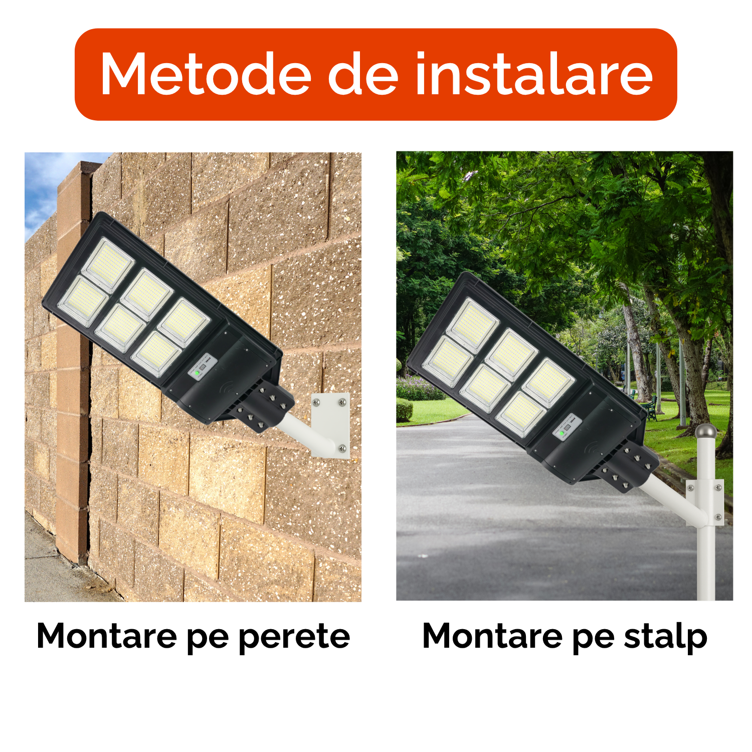 Instalarea se realizează rapid, pe stâlp sau perete (diametru suport 60–80 mm) cu ajutorul kitului inclus. Corpul lămpii este fabricat din ABS de înaltă calitate și aluminiu, oferind rezistență la șocuri și coroziune. Cu un grad de protecție IP67, dispozitivul este complet protejat împotriva intemperiilor – ploi torențiale, praf, zăpadă sau arșiță. Această construcție robustă garantează o funcționare fiabilă pe termen lung, fără griji în orice condiții meteo.