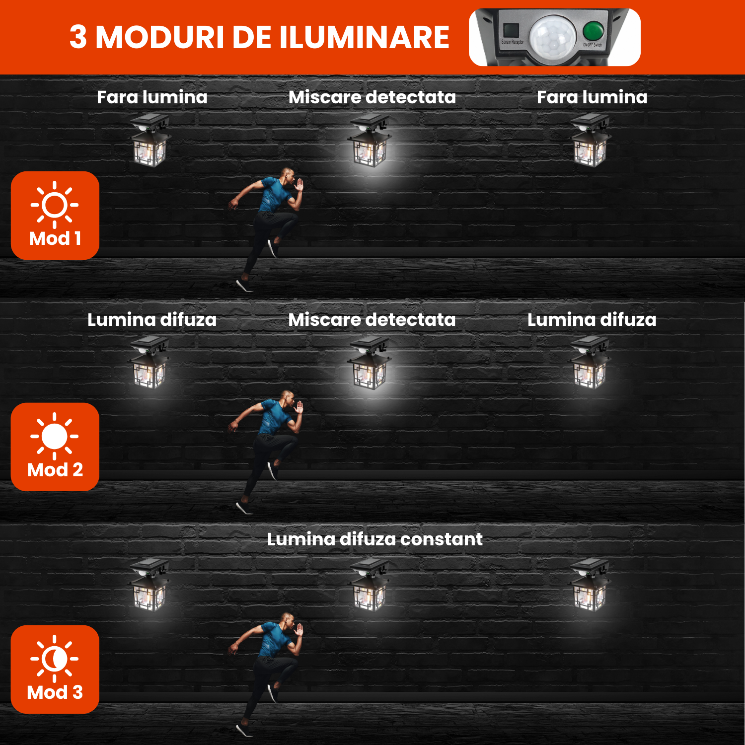 Un mare avantaj il reprezinta senzorul de miscare integrat, care detecteaza activitatea pe o distanta de aproximativ 5–8 metri. Astfel, lampa se aprinde automat cand detecteaza miscare, sporind siguranta locuintei si descurajand prezenta nedorita ⭐. Poti alege intre cele 3 moduri de iluminare, in functie de nevoile tale zilnice: fara lumina pana la detectia miscarii, lumina difuza cu intensificare la miscare sau lumina difuza constanta.