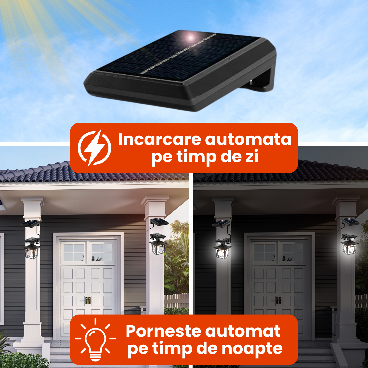 Lampa este echipata cu 17 LED-uri performante ce emit o lumina calda de 3000K, creand o atmosfera placuta si primitoare, ideala pentru spatiile exterioare ale casei. Panoul solar capteaza energia solara pe timpul zilei si incarca automat acumulatorul Li-Ion, asigurand functionarea eficienta pe timpul noptii ☀️. Datorita senzorului de lumina, lampa se activeaza automat la lasarea intunericului si se opreste dimineata, fara interventie manuala.