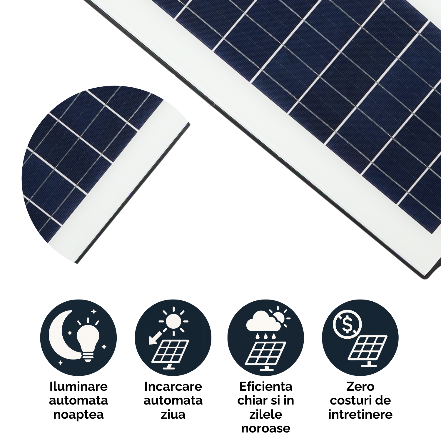 Prin alegerea lampii solare Rixme 200W, optezi pentru un sistem de iluminat eficient și inteligent, care se adaptează automat nevoilor tale și nu te costă nimic la factura de energie. Beneficiezi de lumină puternică exact când îți trebuie, îți securizezi spațiul și economisești bani – totul cu un produs ecologic, ușor de instalat. Experimentează confortul unui iluminat solar modern, iar pentru un plus de siguranță și ambient poți explora și camerele de supraveghere solare sau lămpile solare de grădină decorative, completând astfel ecosistemul tău de iluminat exterior.