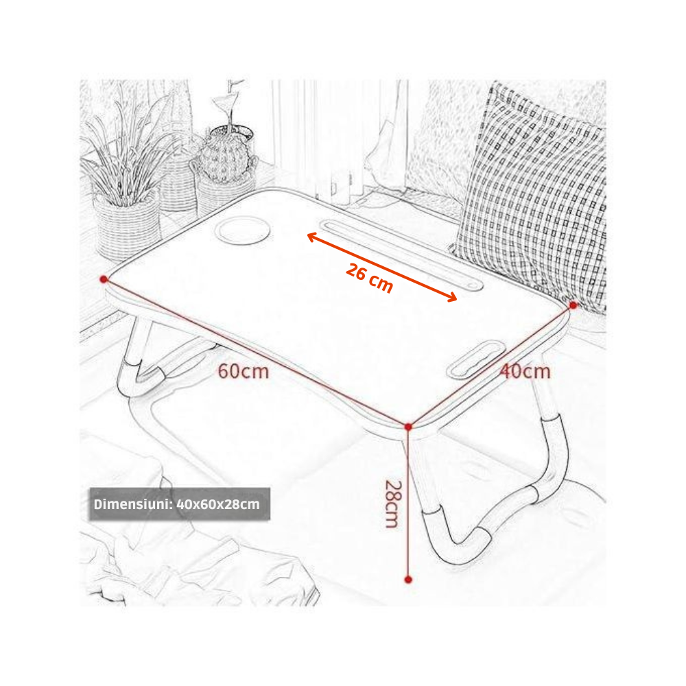 Cu dimensiunile de 60x40x28 cm, masuta ofera suficient spatiu pentru laptop, carti, caiete sau gustari, fara a ocupa prea mult loc. Este usor de strecurat sub pat sau intr-un dulap cand nu este folosita. ♻️