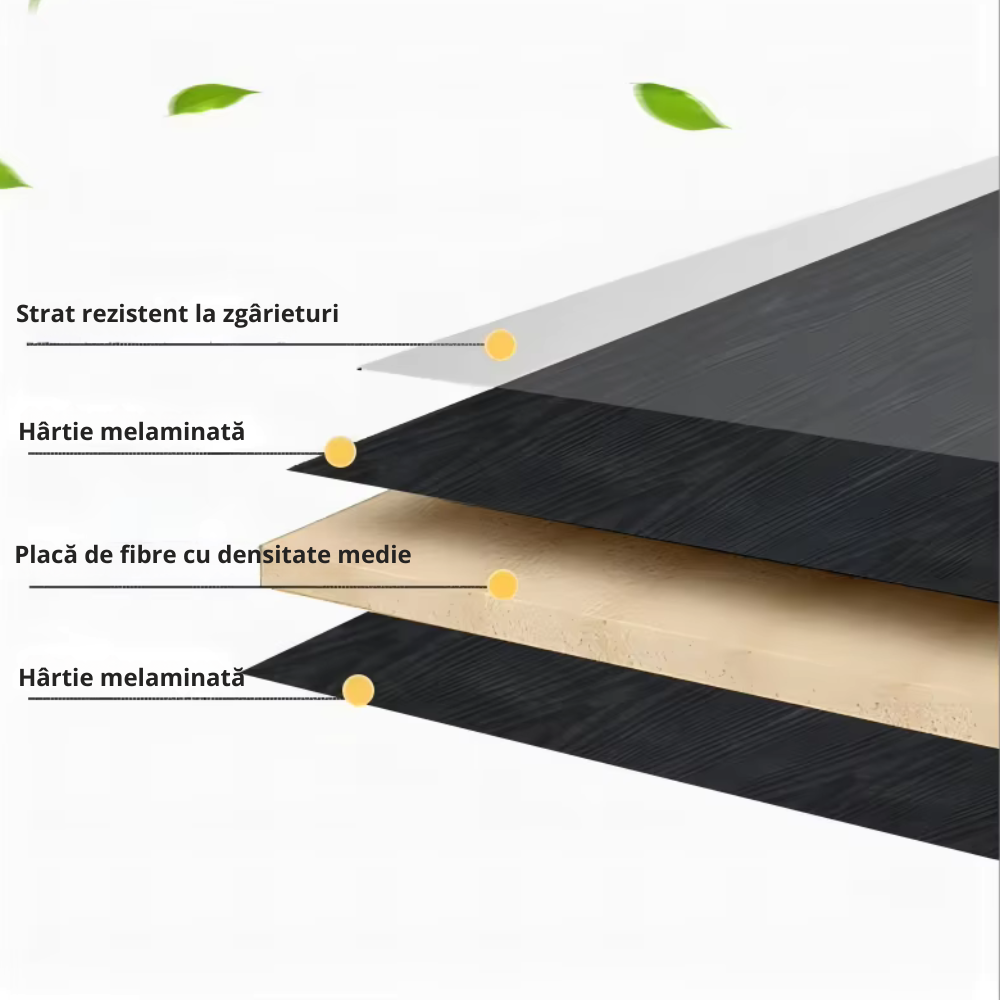 Constructia sa se bazeaza pe placa de fibre cu densitate medie (MDF), acoperita cu hartie melaminata rezistenta la zgarieturi, ceea ce il face durabil si usor de curatat. Suprafata este neteda, sigura si placuta la atingere – ideala pentru copii.