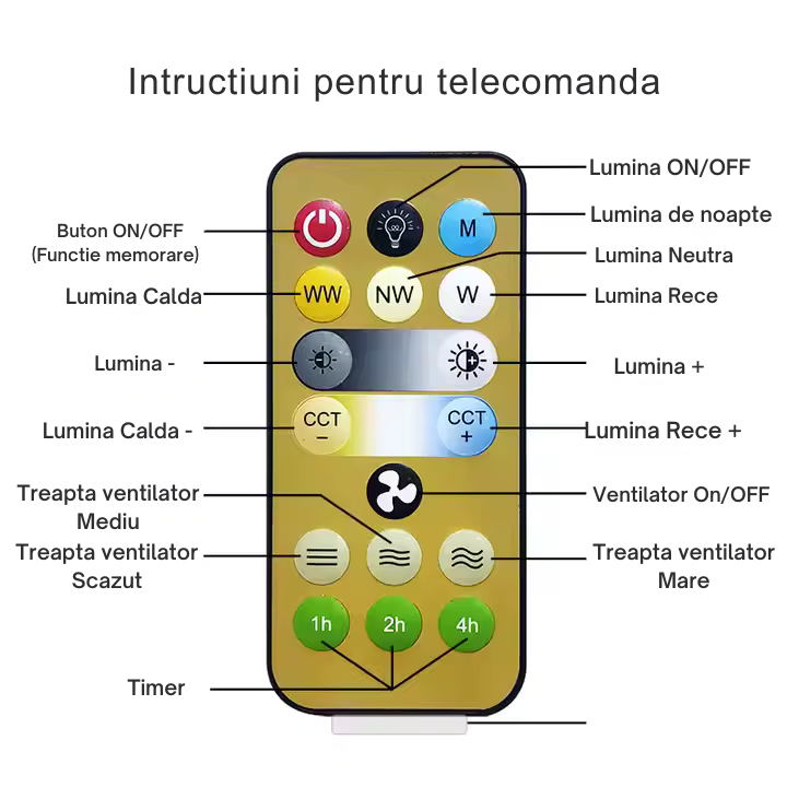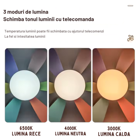 Dupa ce instalezi becul ca pe orice alt bec obisnuit, asigura-te ca ai la indemana telecomanda inclusa in pachet. O singura apasare pe butonul de pornire si deja beneficiezi atat de lumina, cat si de racoare. Folosind comenzile dedicate, poti regla viteza ventilatorului, intensitatea luminii si temperatura de culoare. Daca doresti sa te bucuri de aer proaspat inainte de culcare fara sa lasi ventilatorul pornit toata noaptea, seteaza timerul la 1, 2 sau 4 ore si dispozitivul se va opri automat. In plus, daca preferi o iluminare mai calda pentru a te relaxa seara, seteaza lumina la 3000K si o luminozitate mai scazuta, iar a doua zi vei gasi aceleasi setari datorita functiei de memorie.