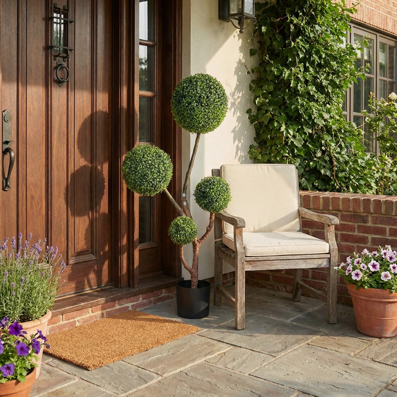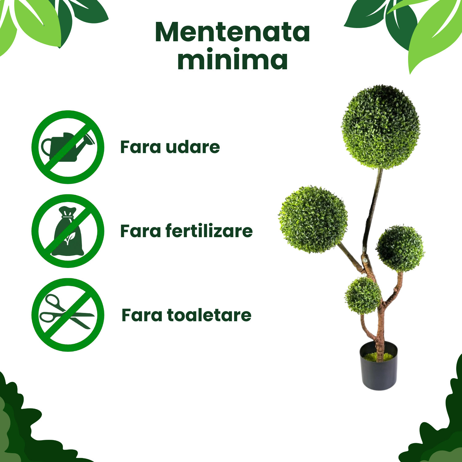 Modelul topiar cu mai multe bile decorative ofera un efect vizual modern si rafinat, potrivit atat pentru locuinte, cat si pentru spatii comerciale. Este alegerea perfecta pentru living, hol, birou, receptie sau showroom, unde doresti un decor verde constant si ordonat. ⭐