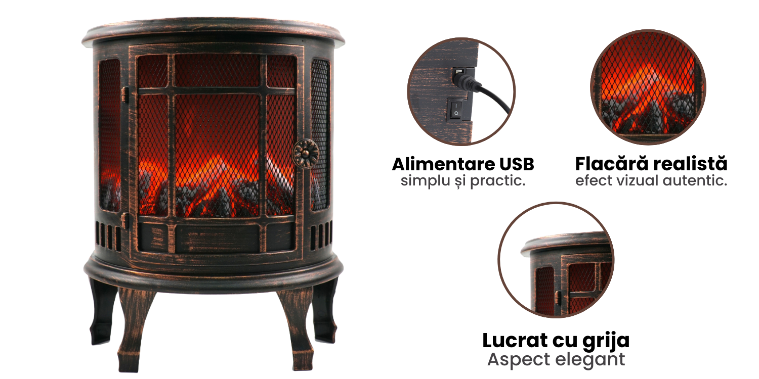 Cu finisaje lucrate cu grija si un aspect retro, semineul aduce un aer rafinat in orice incapere. Culoarea inchisa cu insertii aurii ii ofera un look sofisticat, usor de integrat in decoruri moderne sau clasice. Detaliile atent realizate transforma produsul intr-un element decorativ aparte, nu doar intr-o simpla lampa cu LED.