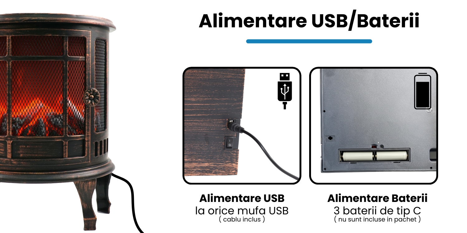Operarea este simpla: conectezi cablul USB sau inserezi bateriile si porni semineul printr-un buton lateral. Materialul din plastic rezistent si finisajul de calitate asigura o utilizare indelungata. Nu necesita intretinere speciala, fiind un produs sigur si economic.