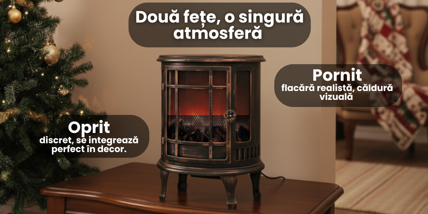 Fie ca este vorba de Craciun, Halloween sau de o seara obisnuita in familie, acest semineu decorativ completeaza atmosfera si aduce un plus de farmec. Atunci cand este pornit, flacara realista ofera o caldura vizuala placuta, iar cand este oprit, ramane un obiect de decor discret si elegant.